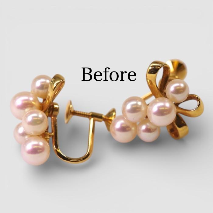 K18のベビーパールがたくさん付いたイヤリングを、ピアスへカスタマイズ(リフォーム)した事例です。