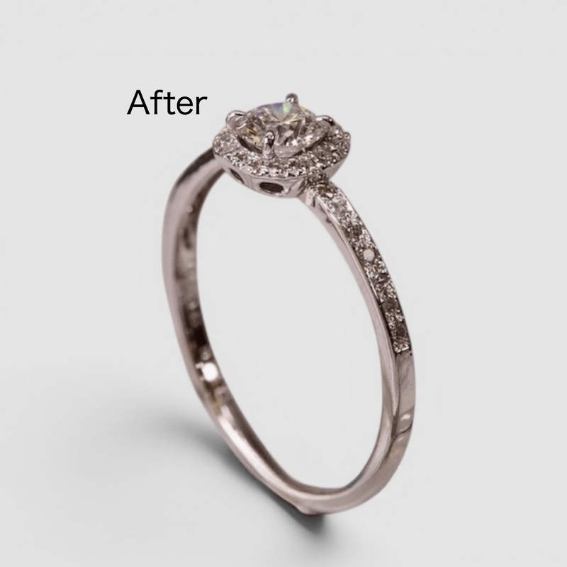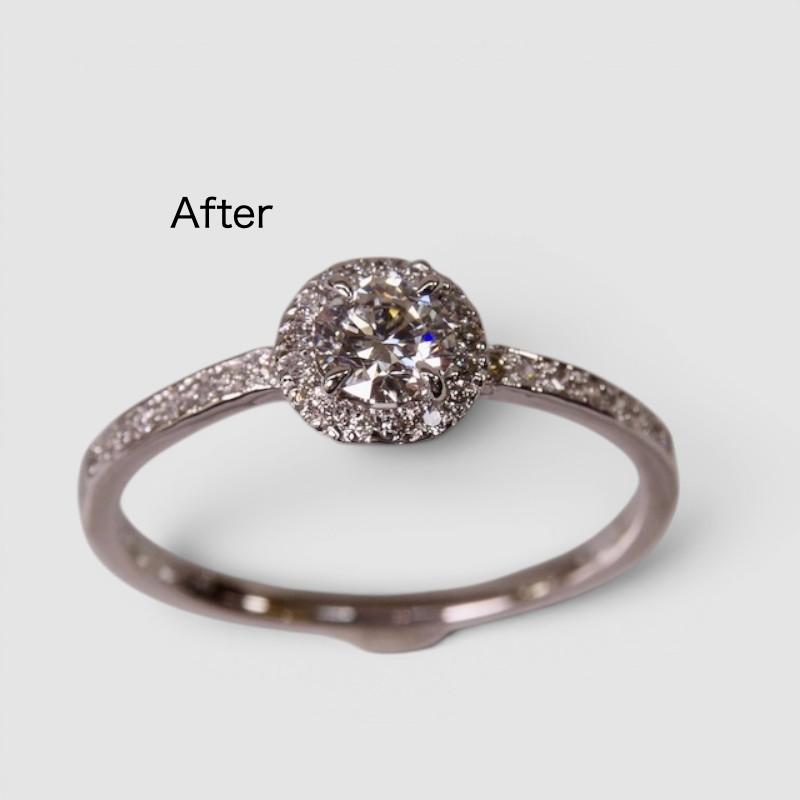 変形を直して、中石のダイアモンドを留めてクリーニング、磨いてロジウムメッキ で仕上げました。
