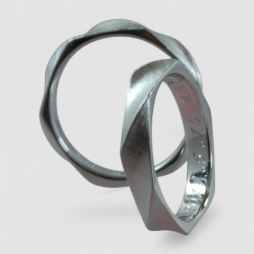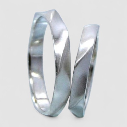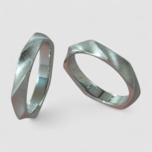 他にはない個性が光る、立体的なツイストデザインのオリジナルマリッジリングです。多面的なフォルムが光を美しく反射し、見る角度によって様々な表情を楽しめます。