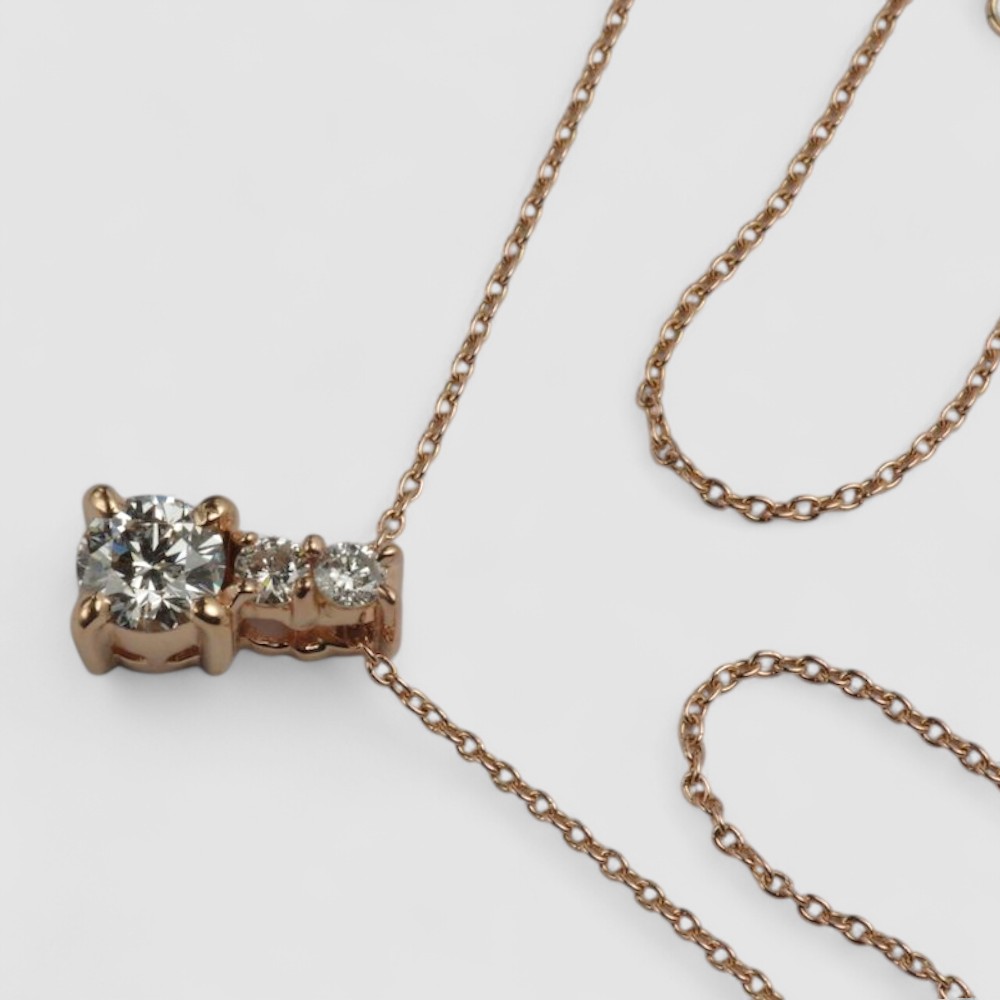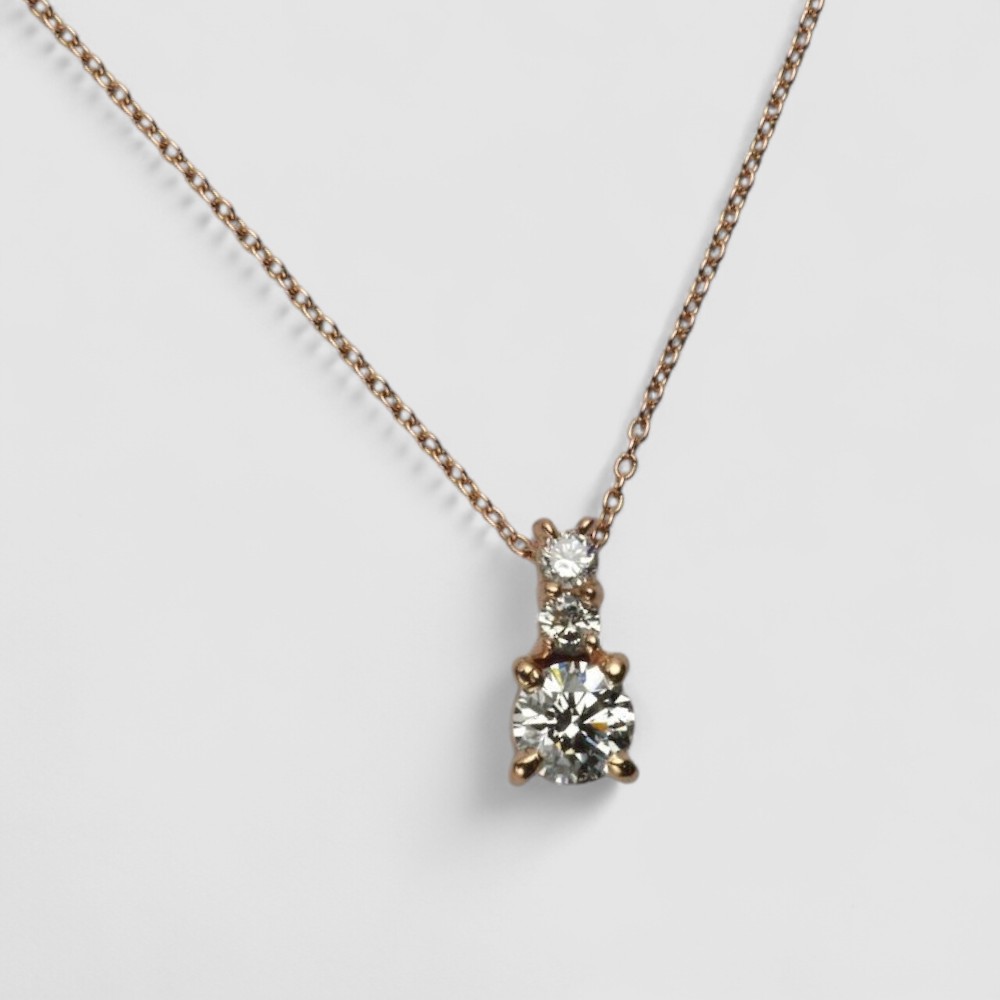 使用してK18ピンクゴールドの素材で縦に3個のダイアモンドペンダントを制作することになりました。エンゲージリングの土台のプラチナは下取りしました。ネックレスはご持参のメレダイアモンドお花モチーフペンダントを外して、そこにぶら下げるように制作しました。とても可愛く出来あがり、お客様は大喜びでした。