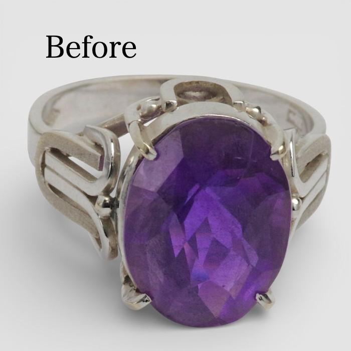 585(K14WG)アメシストリングのリフォームにご来店のお客様。「眠っているアメシストリングをもっと使用できるような作り直して欲しい」というご希望でした。いくつかのデザインをご提案して、アメシストを横に留めたシンプルなデザインにしました。素材はお客様ご希望のPt900です。新しく生まれ変わったアメシストリングをとてもお気に召していただきました。
