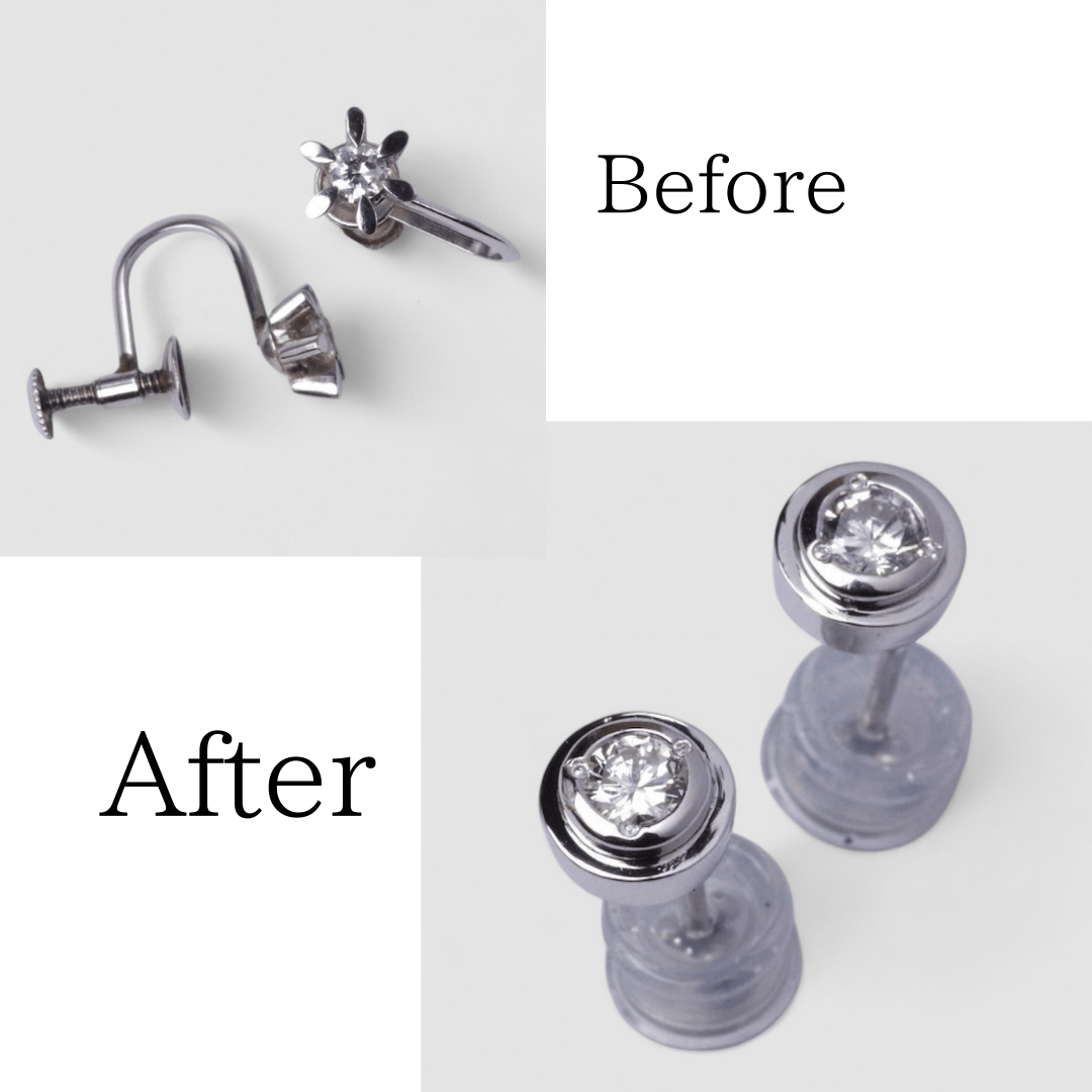 「イヤリングをプラチナ・ダイヤモンドのピアスに作り替えてほしい。ダイヤが小さいので、大きく見えるように作ってほしい」というご要望をいただきました。