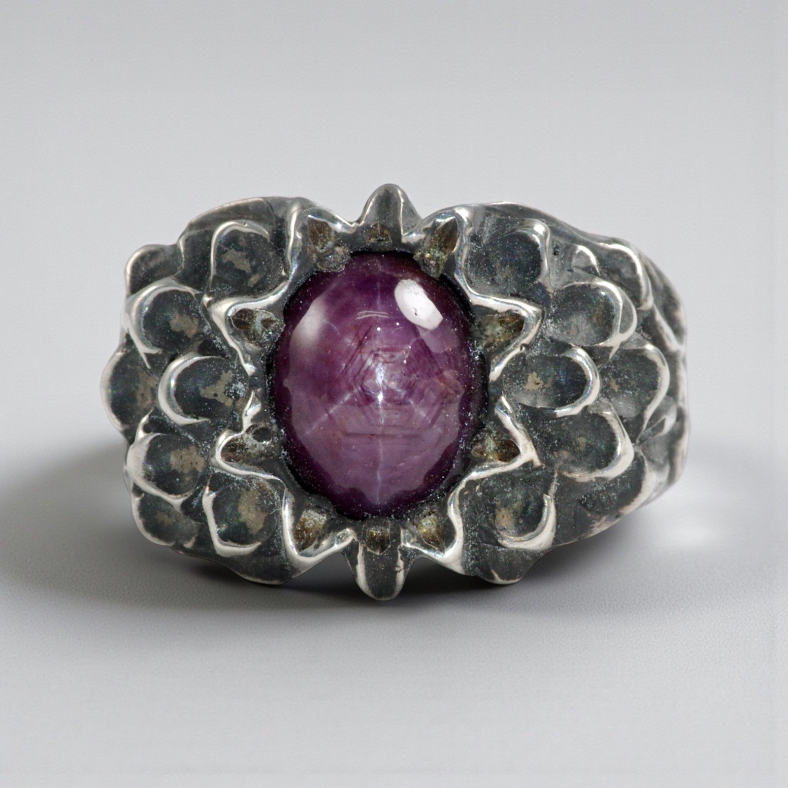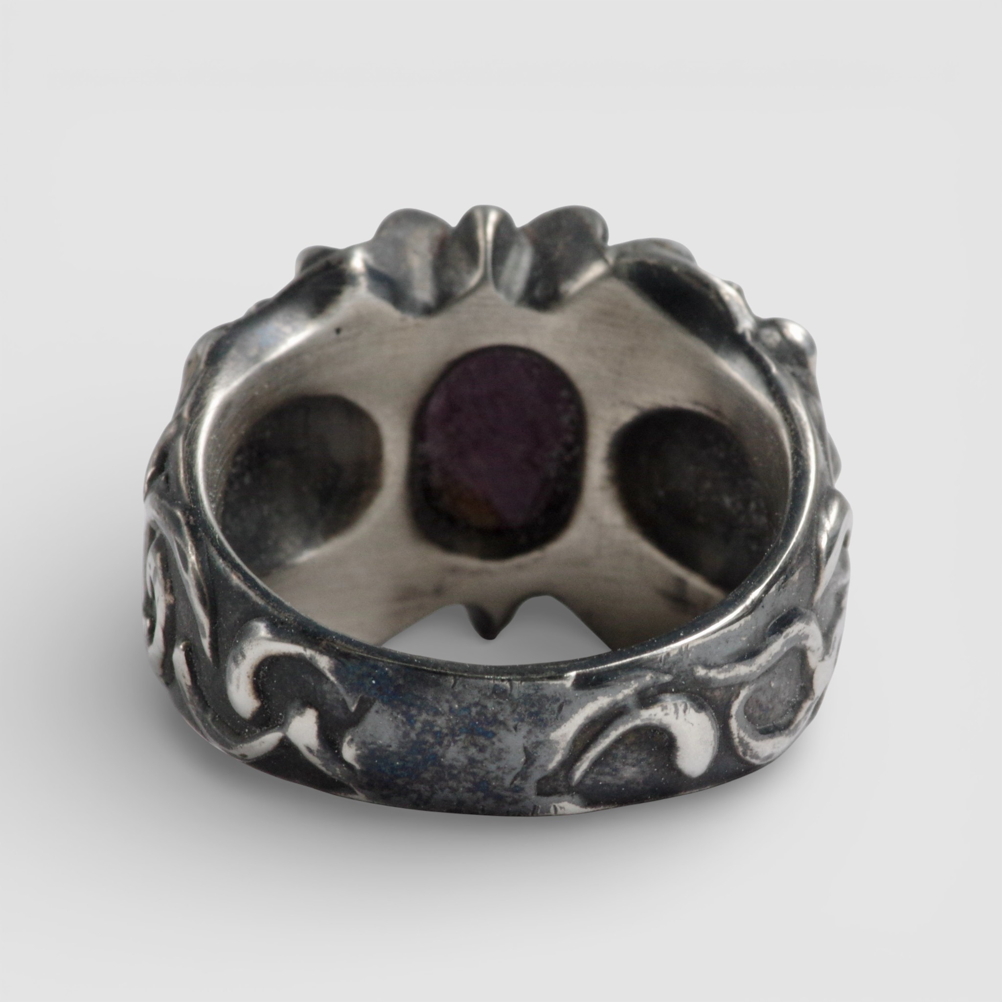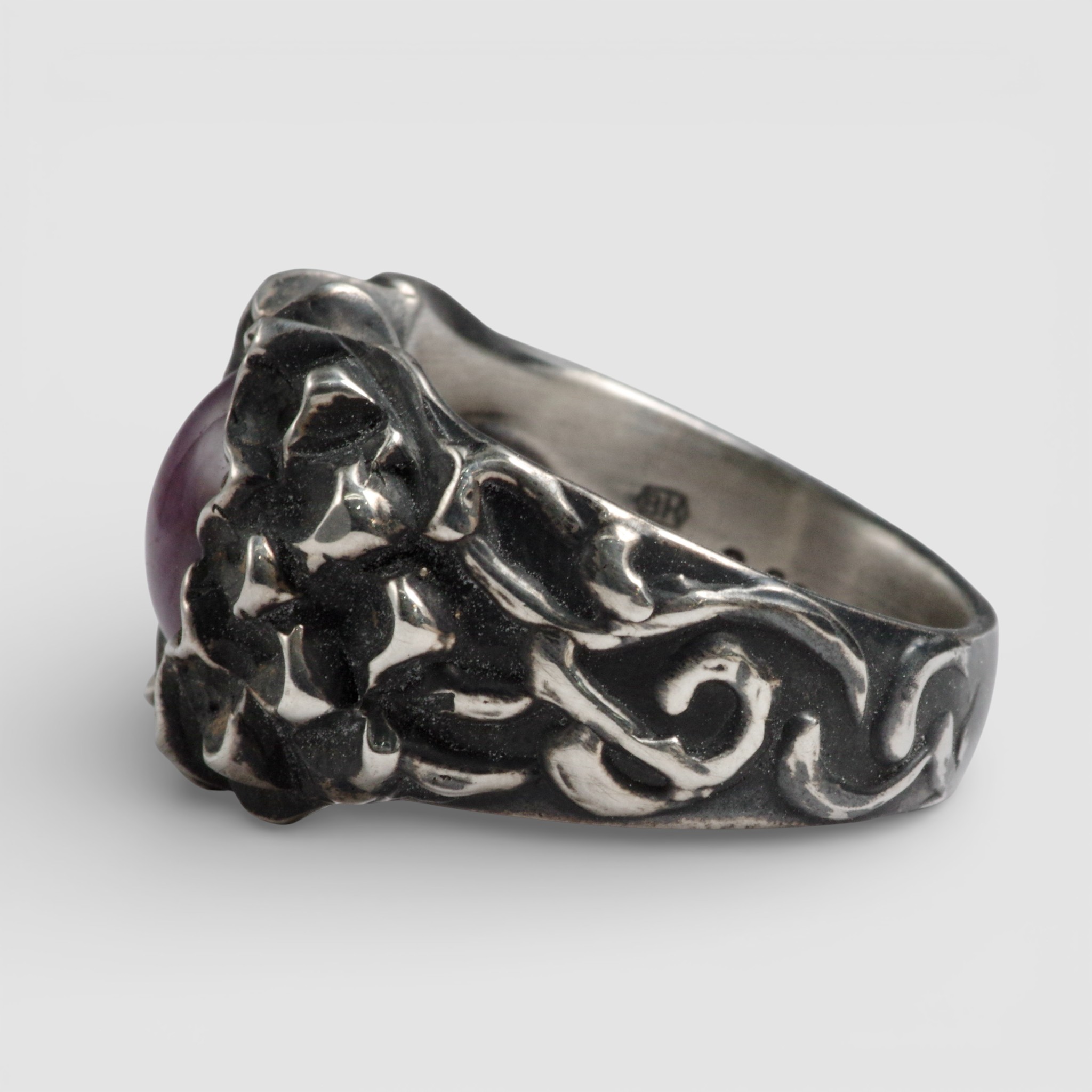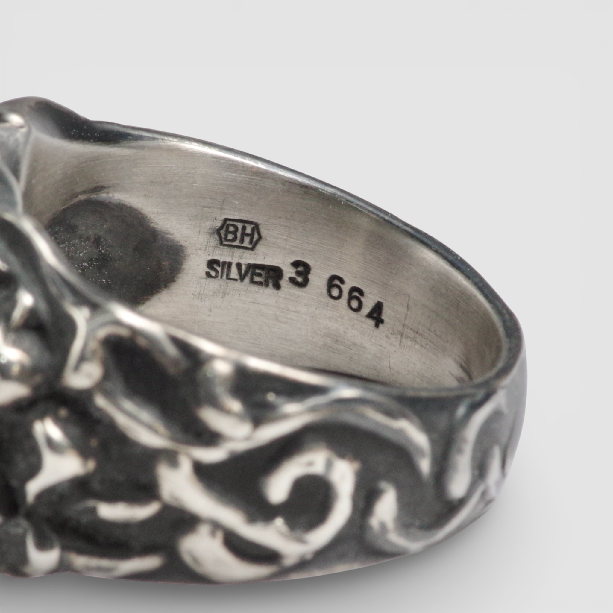 リング腕には唐草模様を施し、クラシカルで上品な雰囲気に。仕上げはほどよく燻しを入れることで、彫りの陰影が際立つシックな表情を楽しめます。