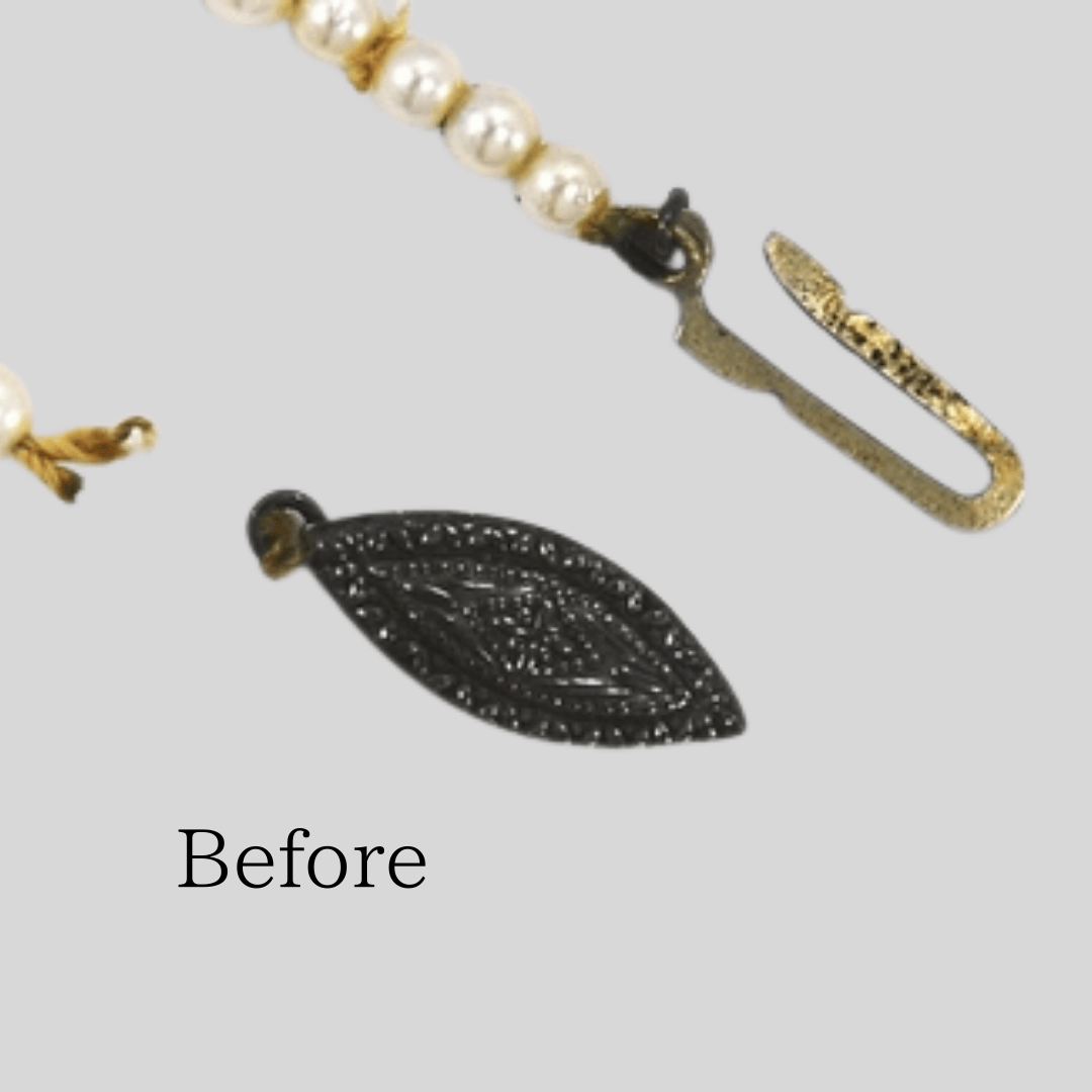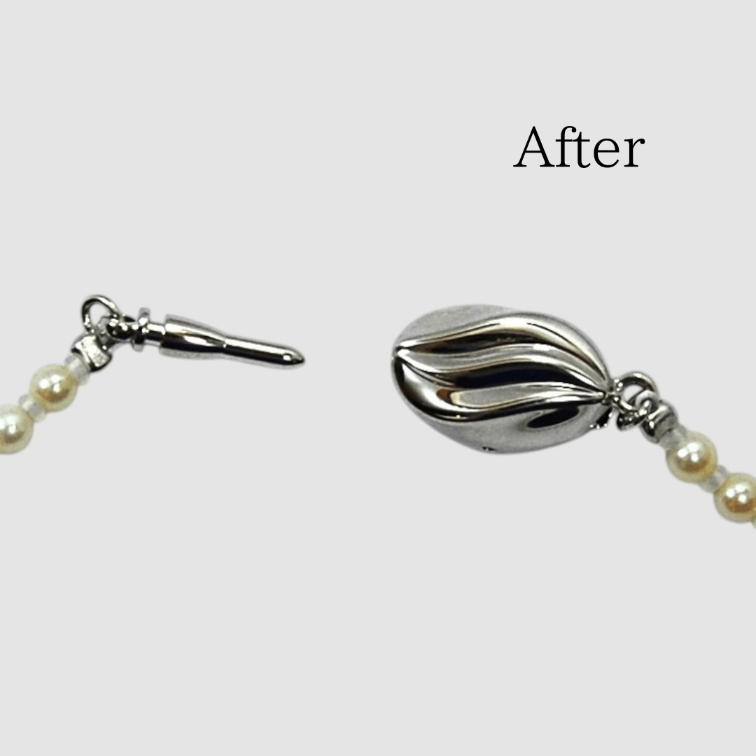 糸のゆるみと金具の破損でお困りでしたが、新しく糸を組み直し、着脱が簡単なワンタッチ式のクラスプ(金具)へ交換。安心して使える、美しいネックレスに生まれ変わりました。