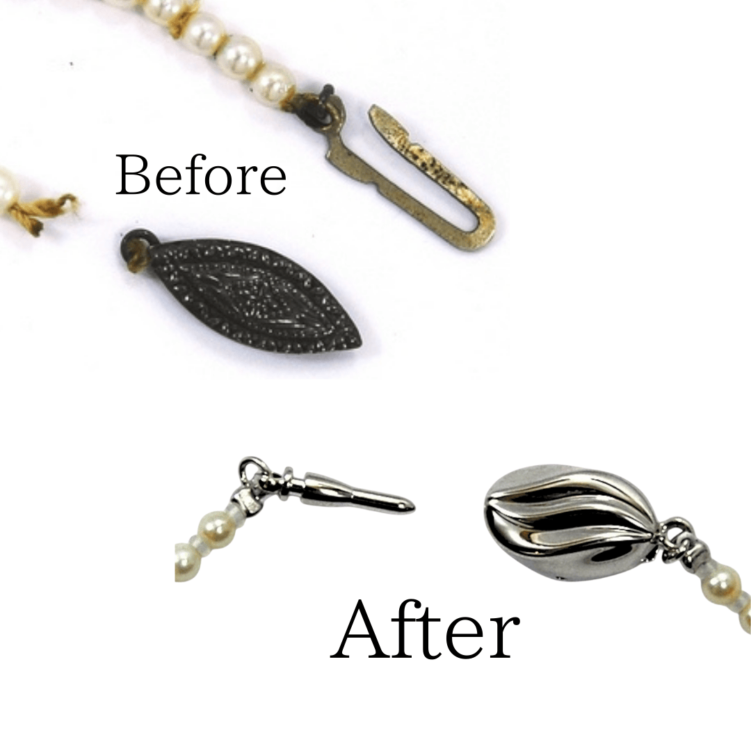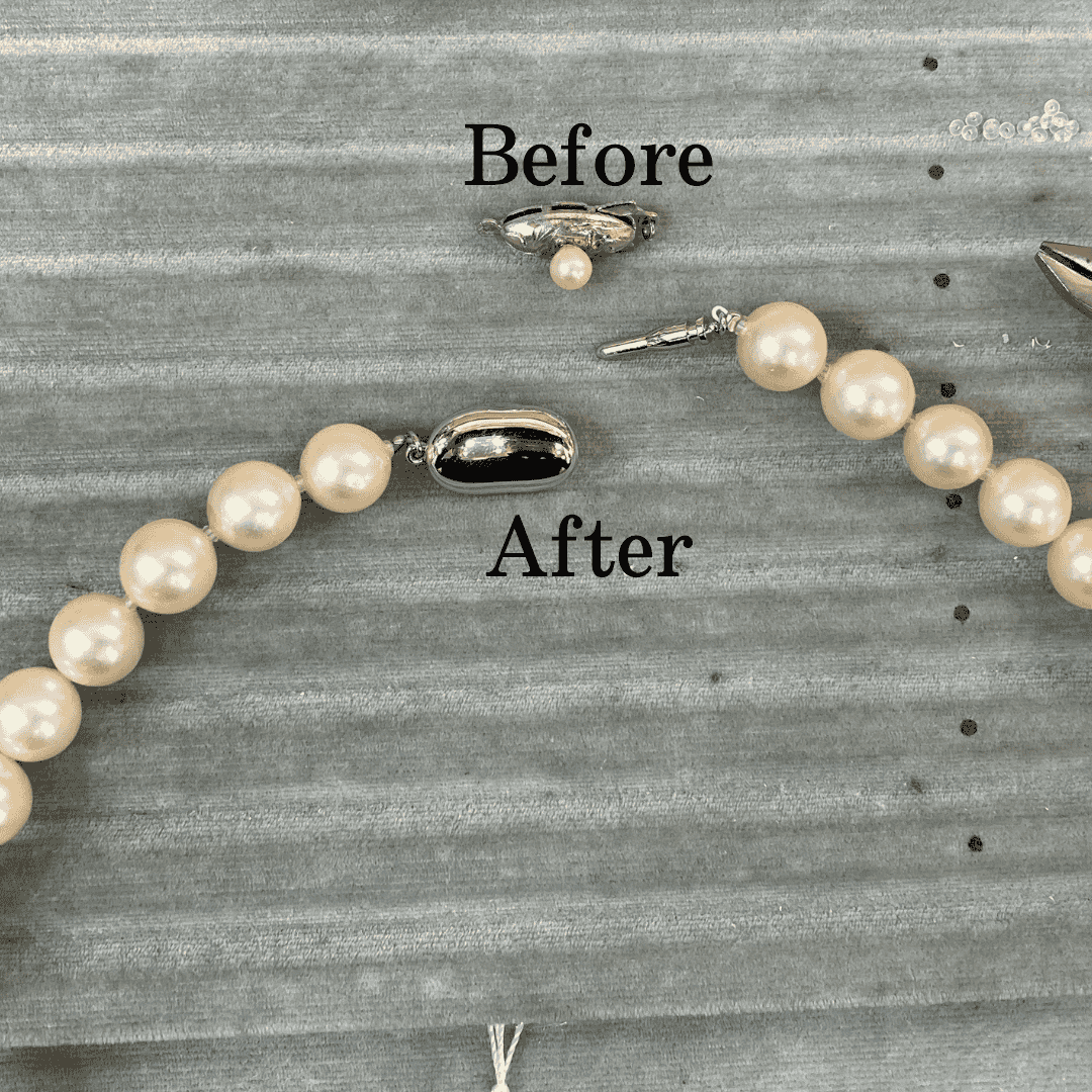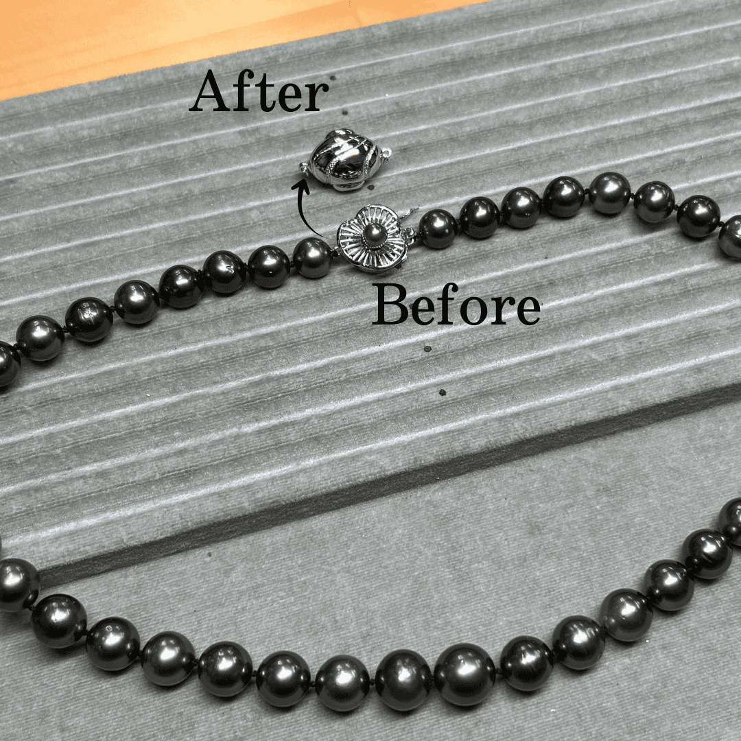 修理内容:お客様のお持ちのパールネックレスの糸替え、および金具(クラスプ)の交換