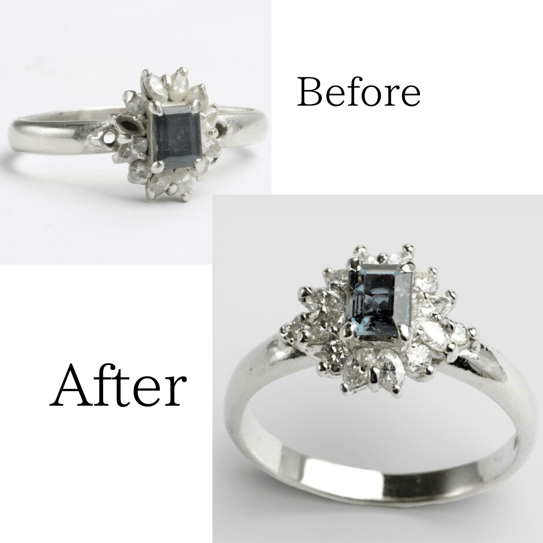 | アレキサンドライトのダイヤモンド取り巻きリング。取り巻きのメレダイヤが3個紛失し、リング自体も変形もしておりました。 こちらで石枠に合うダイヤを探し石留めします。今回は石を留める爪もほぼ欠損しているため作り直しました。リングの歪みを修正し、最後に仕上げの磨きをするとAfter画像のように生まれ変わります。 |