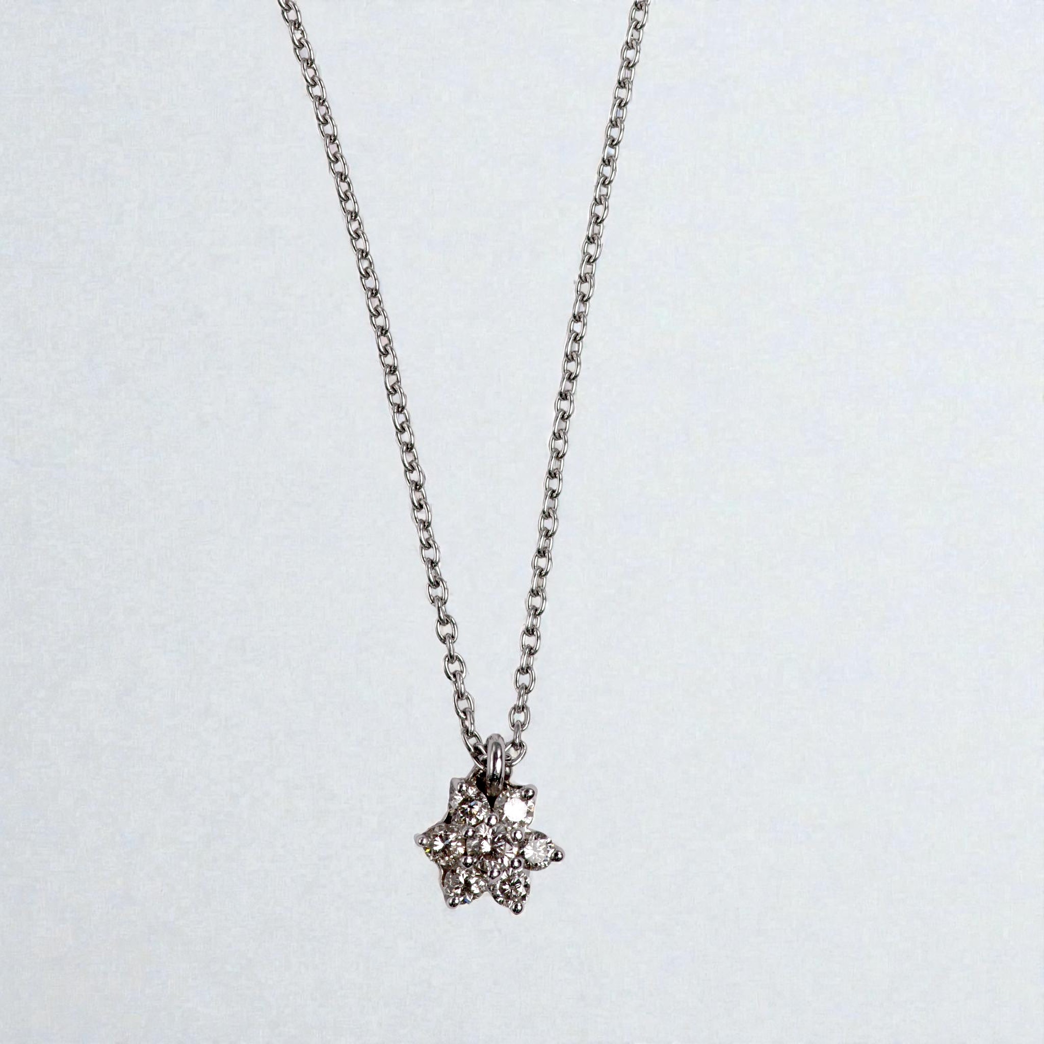 ラウンドカットのダイヤモンドをフラワーモチーフに配した、繊細で華やかなK18WG(ホワイトゴールド)製のペンダントネックレスです。