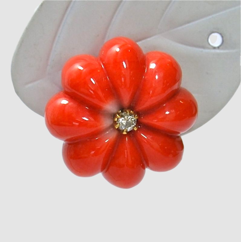 K18 サンゴ&ダイヤ オリジナルデザインピアスは、丸みのあるサンゴを8枚の花びら状にカットし、花芯にメレダイヤを留めた華やかなフラワーモチーフピアスです。