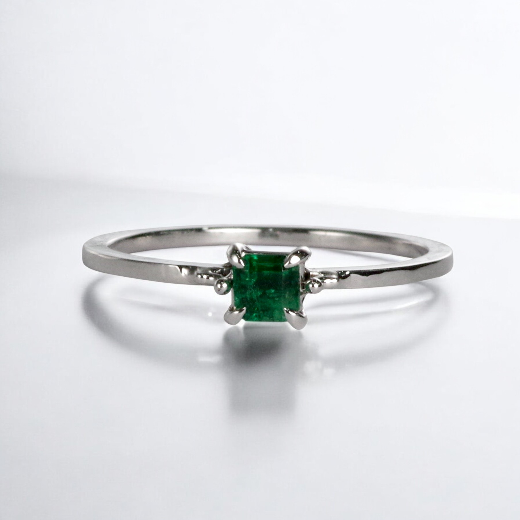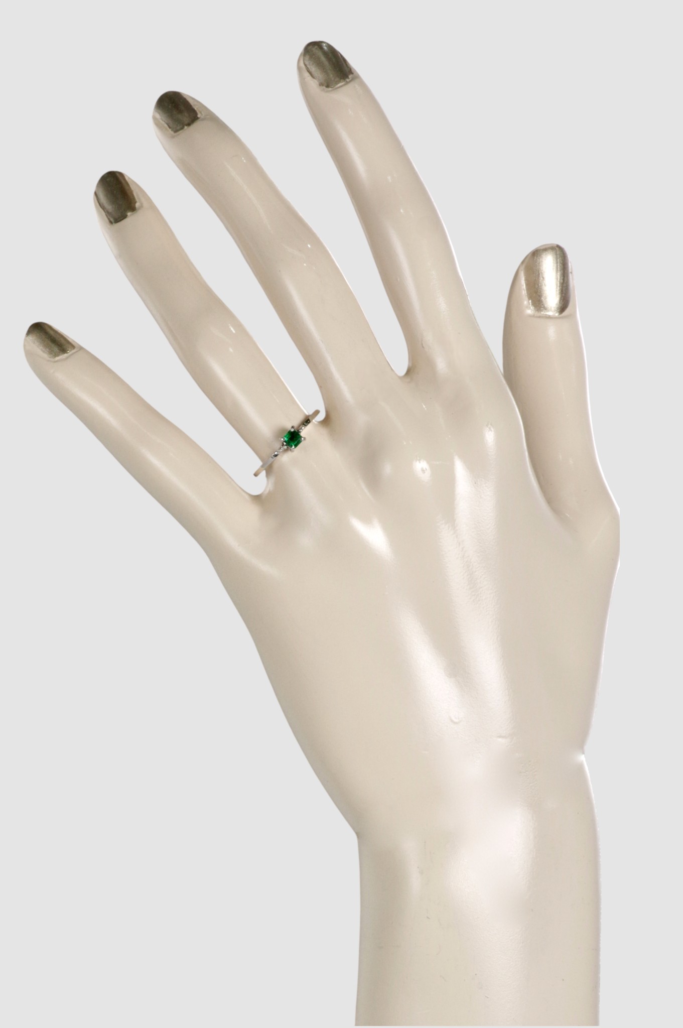 Pt900 エメラルド リングは、深いグリーンのエメラルドを主役に、直線的なラインで構成された洗練美が漂うデザインです。