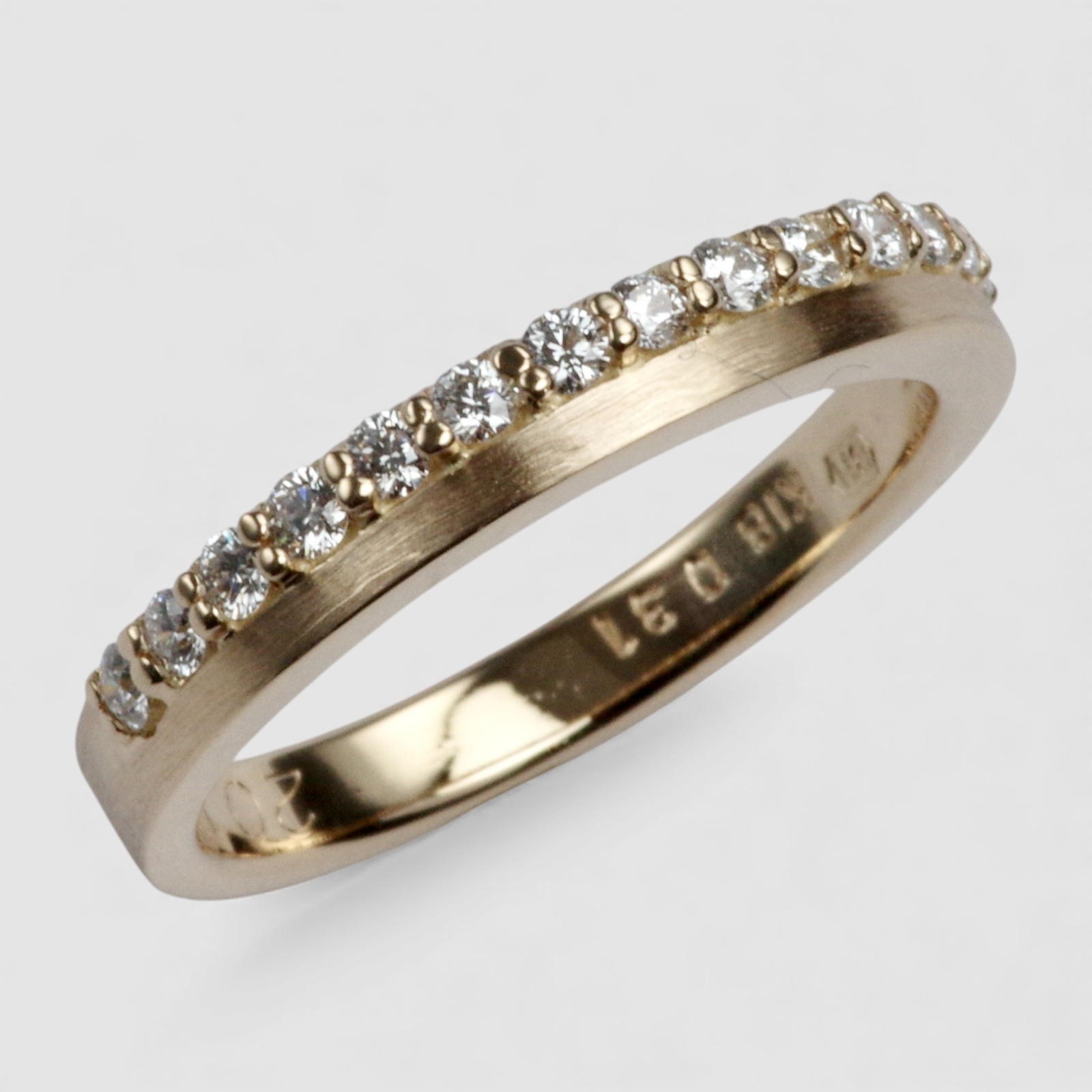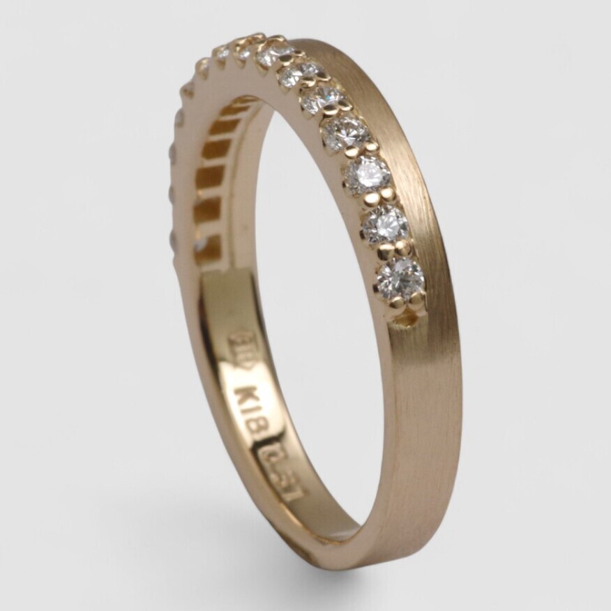 K18ゴールドとマットなヘアライン仕上げを組み合わせ、ダイヤモンドの輝きが引き立つ上品な印象に。日常でも使いやすいデザインです。