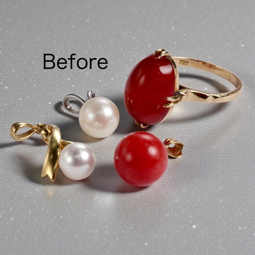 色味の異なるカーネリアン、赤珊瑚、パールをバランスよく配置。不要になった指輪の枠やペンダント金具(バチカン)はその場で下取りし、制作費に充てることでリーズナブルに仕上げました。