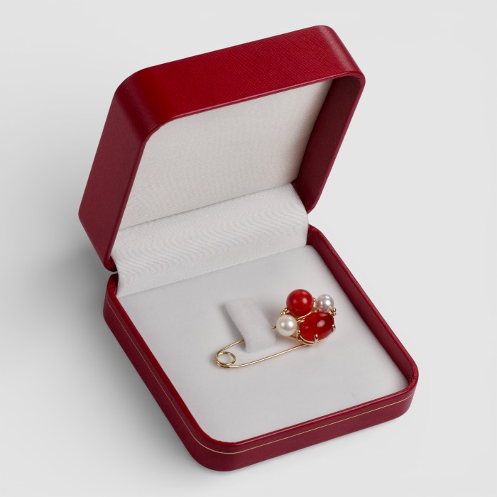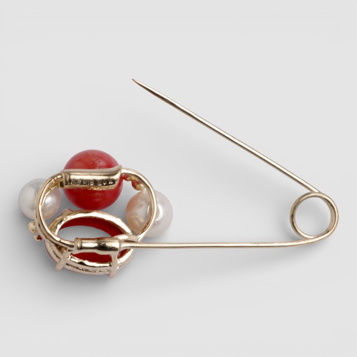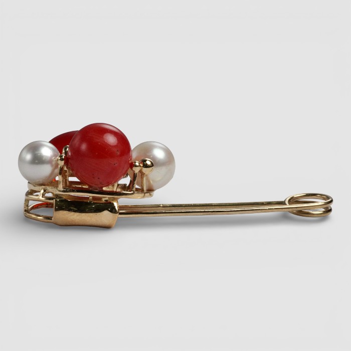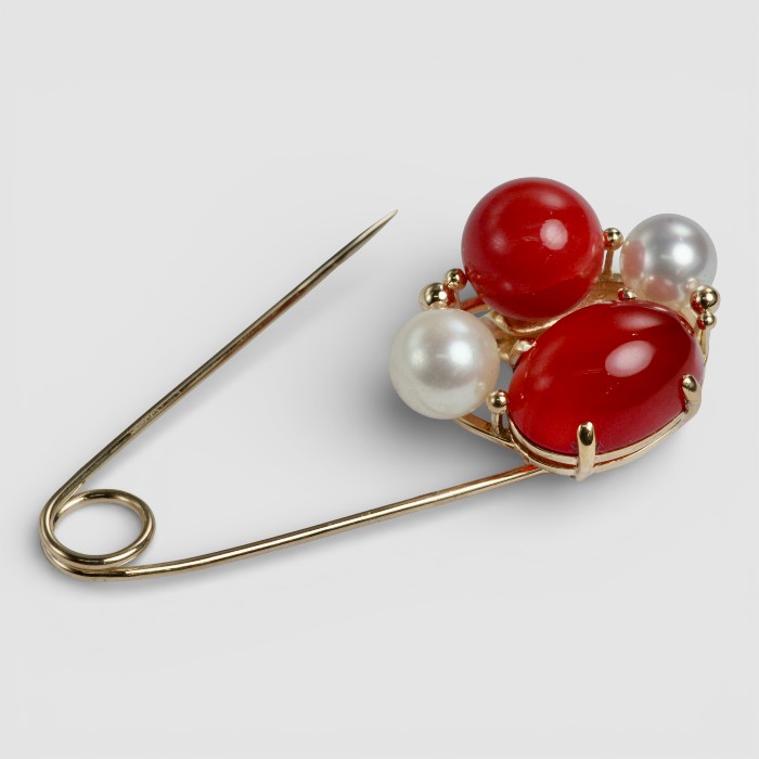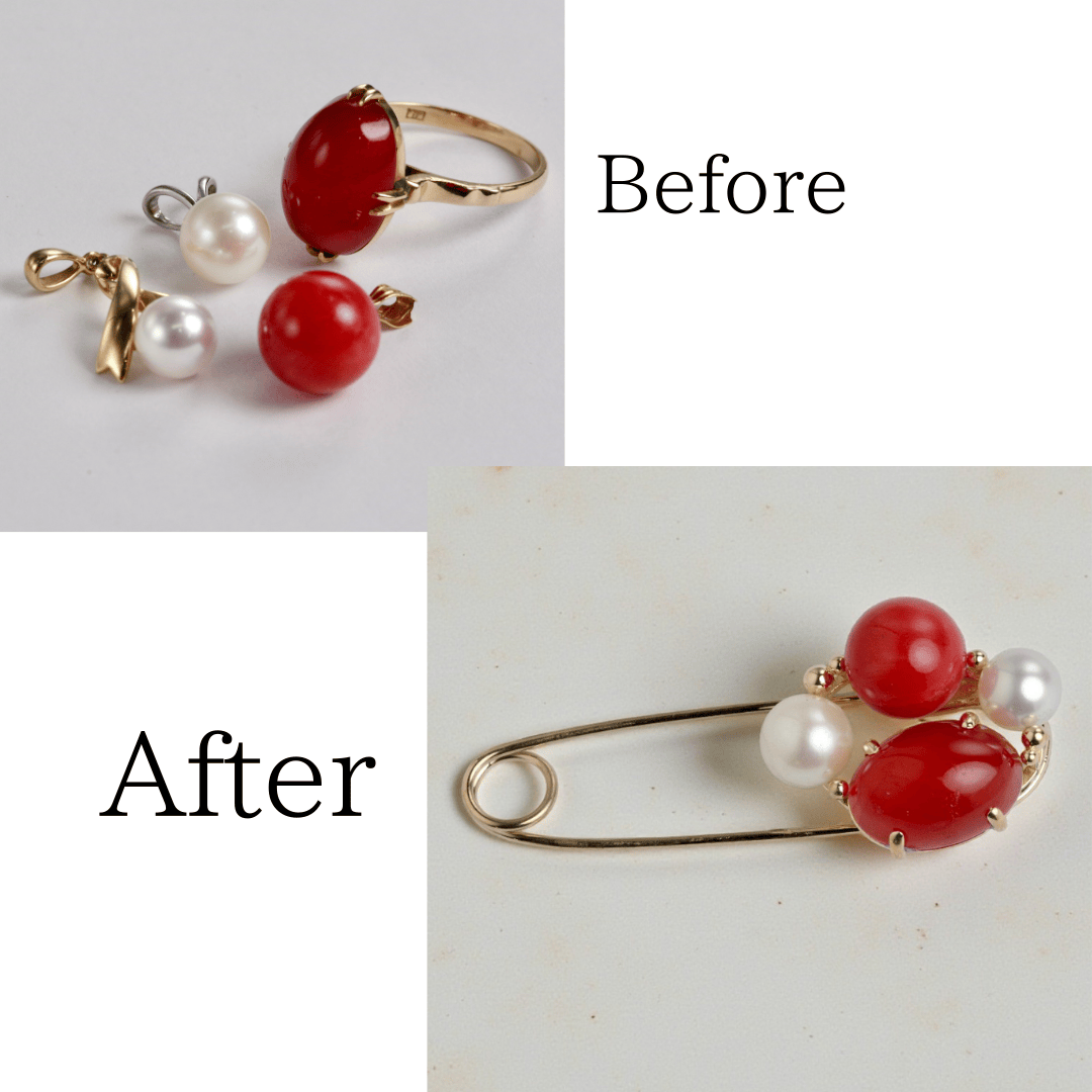 指輪のカーネリアン、ペンダントの赤珊瑚とパール2個を組み合わせ、K18安全ピン型ブローチへリフォームしました。