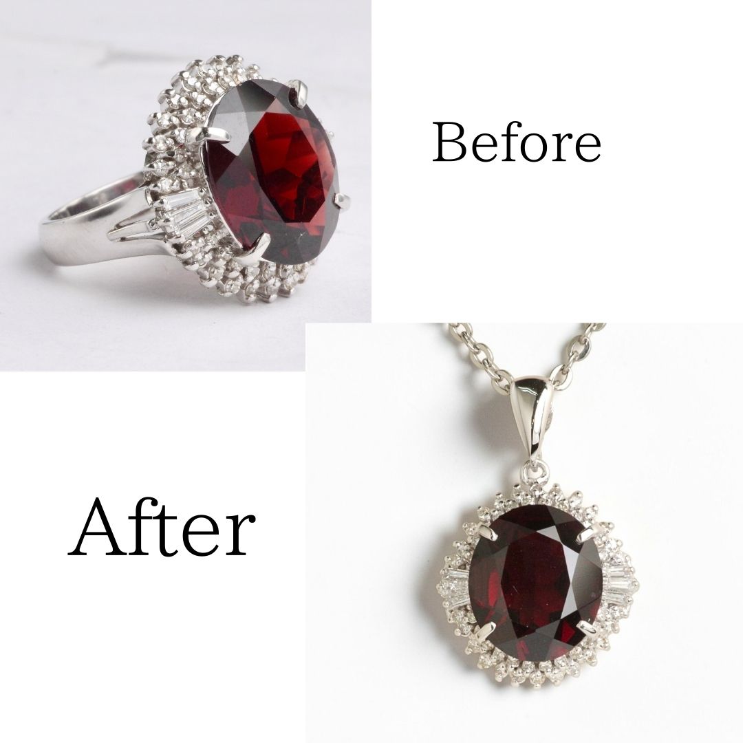 「せっかくお母様からプレゼントされた誕生石の指輪だけど、出番が少なくて…」というご相談を受け、大きなガーネットとダイヤの取り巻きを活かしたペンダントへリフォームした事例です。