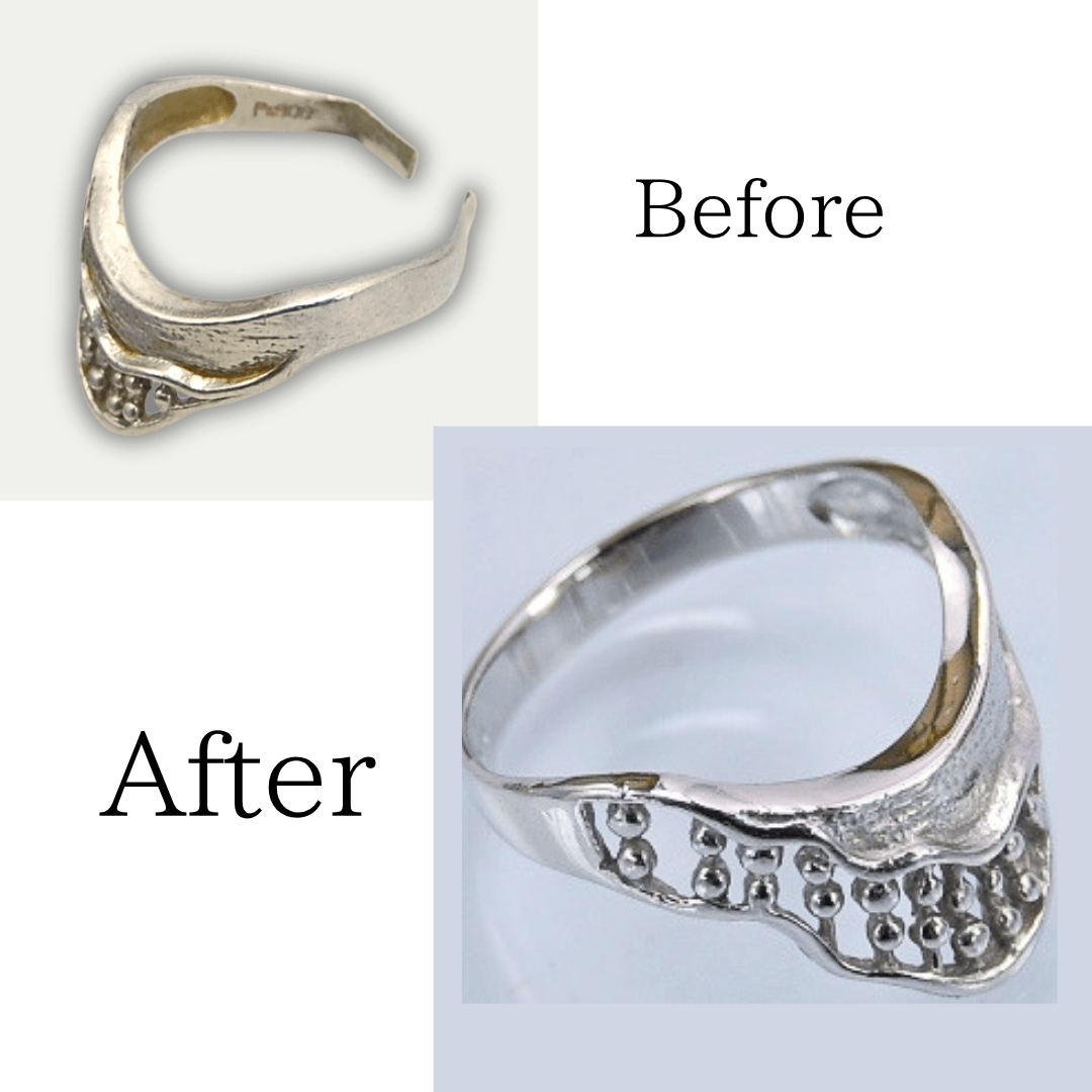 お客様のサイズにしてロウ付け、その後形を綺麗に整え、ロジュウムメッキして出来上がり。