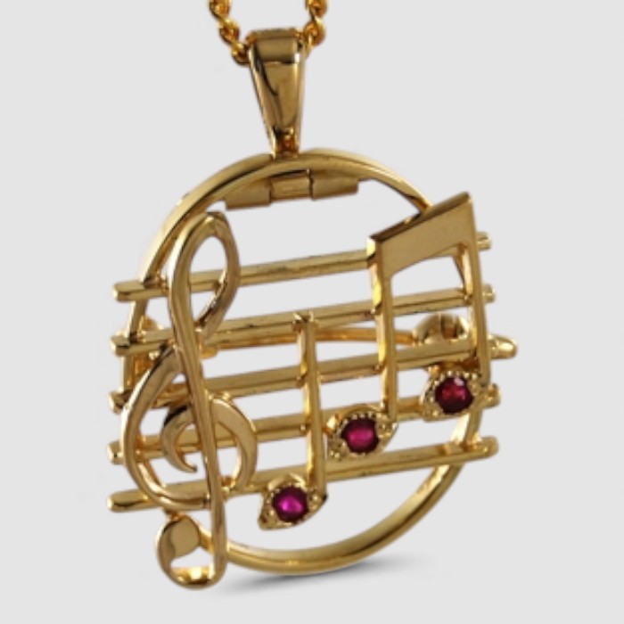 M様より「音符モチーフのペンダント兼ブローチ」をオーダーいただきました。K18の温かみとルビーの彩りが調和した、愛らしいジュエリーです。