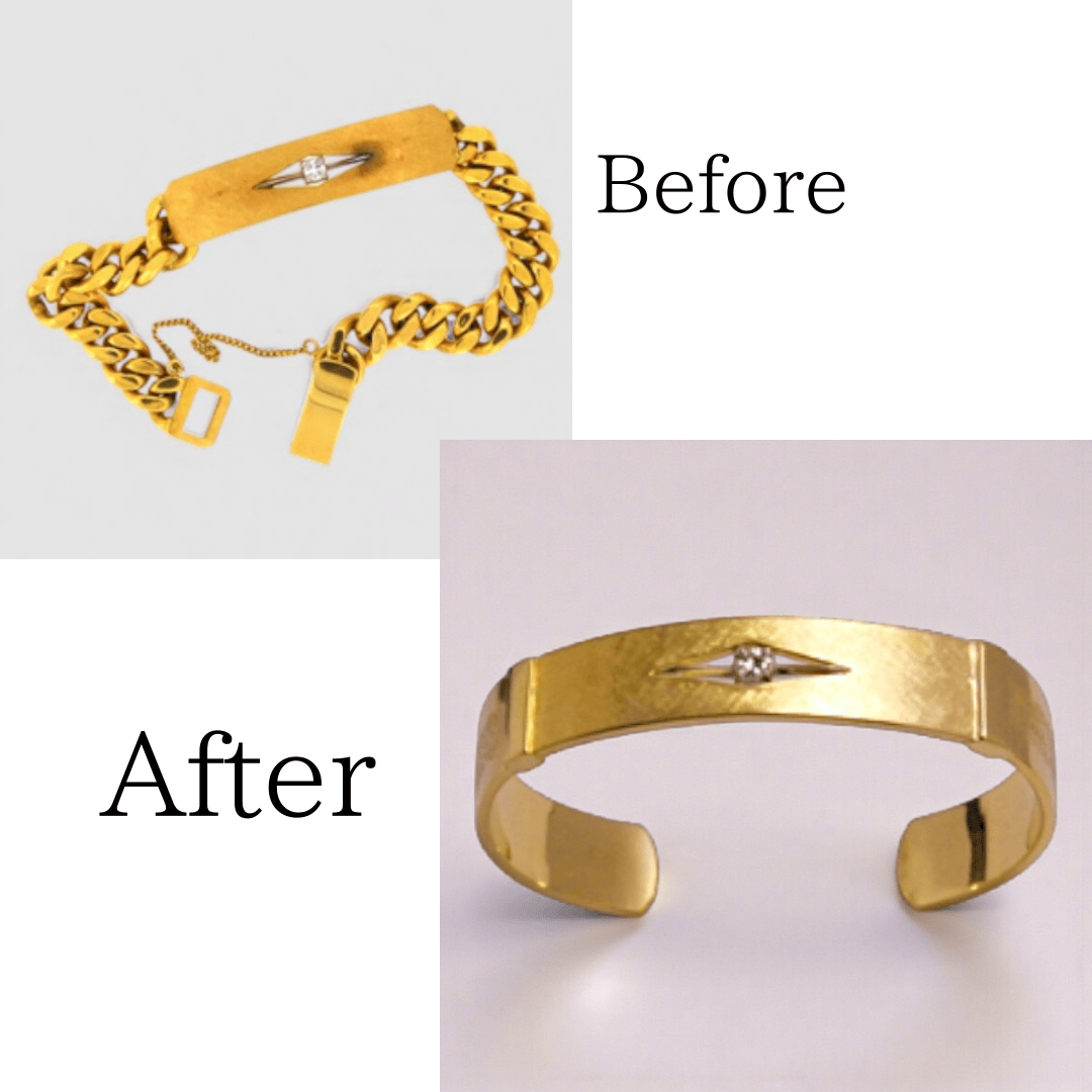 K様より「ブレスレットのチェーン部分をバングルにして欲しい」とのご依頼。元のデザインを活かしつつ、スタイリッシュなバングルへ生まれ変わりました。