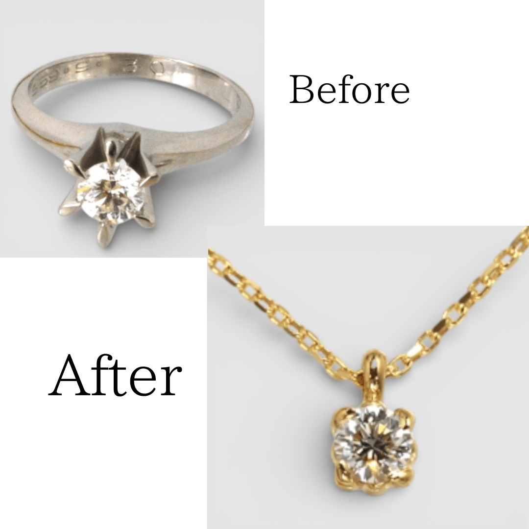 「プラチナのダイヤ立爪リングを、K18イエローゴールドのダイヤペンダントネックレスに作り替えたい」とのお問い合わせをいただきました。