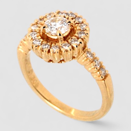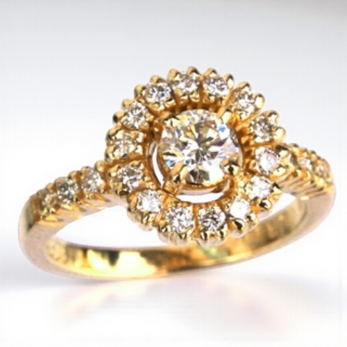 「K18イエローゴールドでダイヤの婚約指輪を」というN様からのご依頼で制作しました。最高品質のダイヤモンドを中心に、メレダイヤを贅沢にあしらった、太陽のようにまばゆく輝くエンゲージリングです。