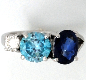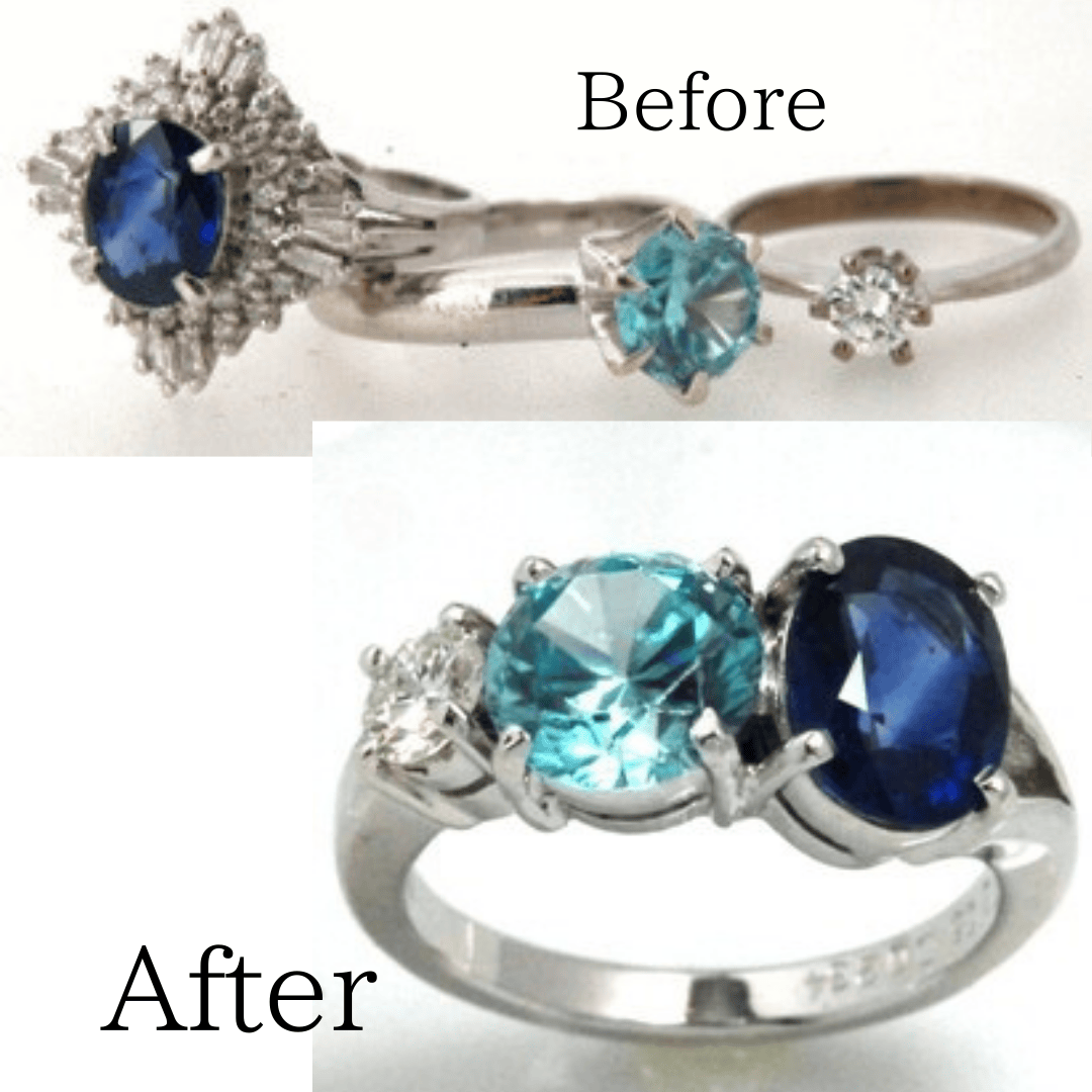 プラチナ、K14WGのサファイア、ダイヤ、ブルートパーズの指輪3本ご持参でご来店のT様。「プラチナで3個の石を横に並べたシンプルな指輪を制作して欲しい」と言うご注文に応えて制作しました。サファイアの指輪は、メレダイヤ、テーパーダイヤ取り巻きで周りのダイヤは今回使用しないデザインなので返却しました。出来上がりにとてもご満足頂きました。