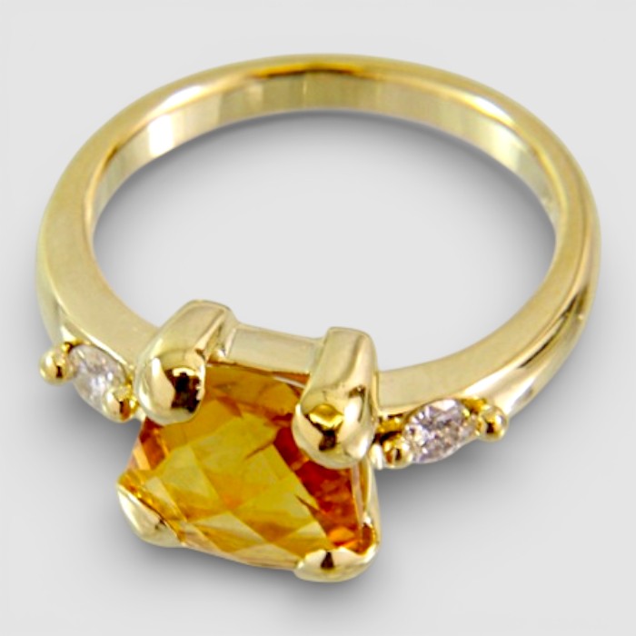 ご持参いただいた2粒のメレダイヤを、両サイドに1粒ずつ配置。センターのシトリンを挟むシンメトリーなデザインにすることで、バランスの良い上品な指輪になりました。