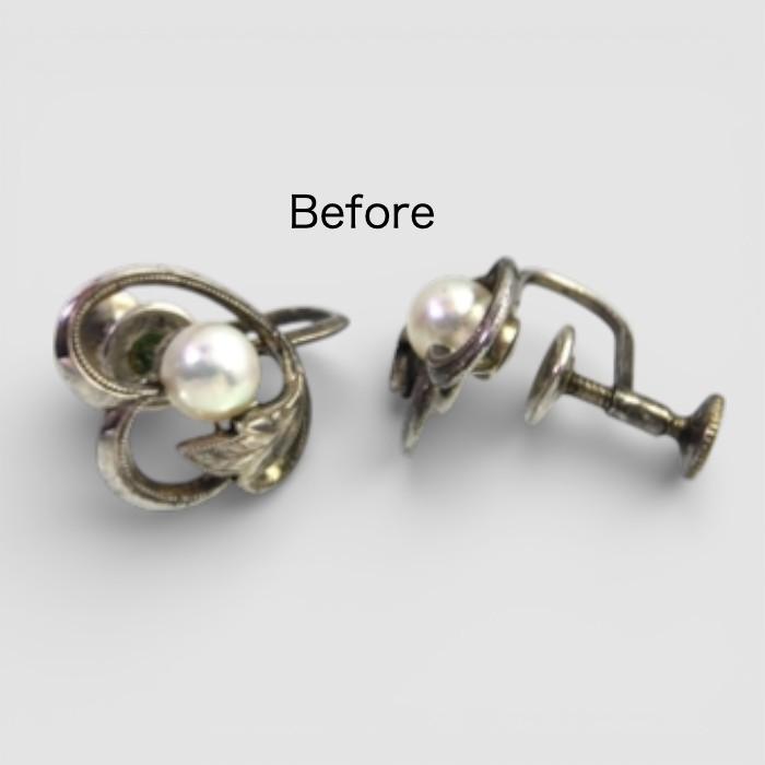 お客様のご希望で、シルバーのデザインパールイヤリングを K18の一粒パールピアスにリフォームした事例です。
