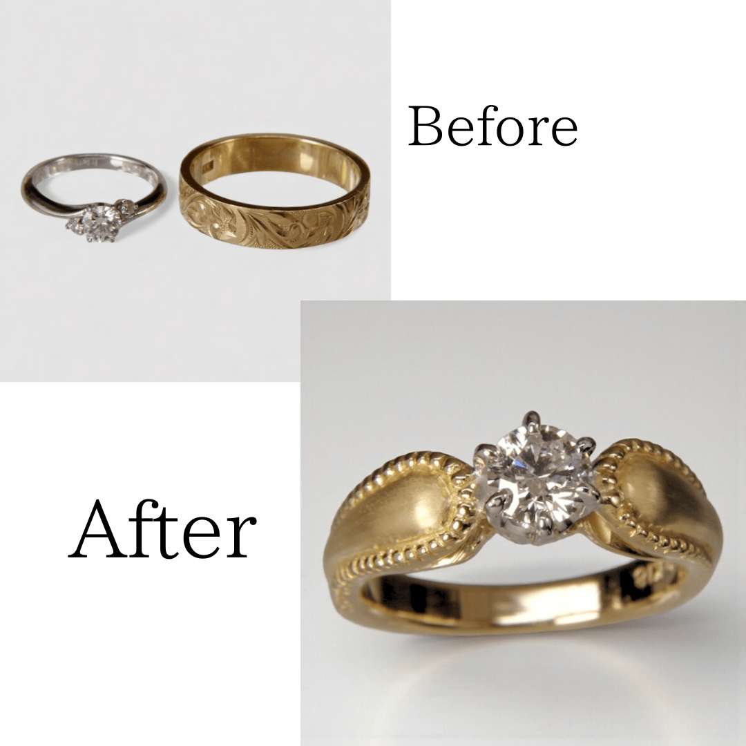 S様より「プラチナの婚約指輪と、手持ちのK18彫り入りリングを使ってリフォームしたい」とのご依頼。手持ちのジュエリーを賢く活用し、こだわりのコンビリングへ生まれ変わらせました。