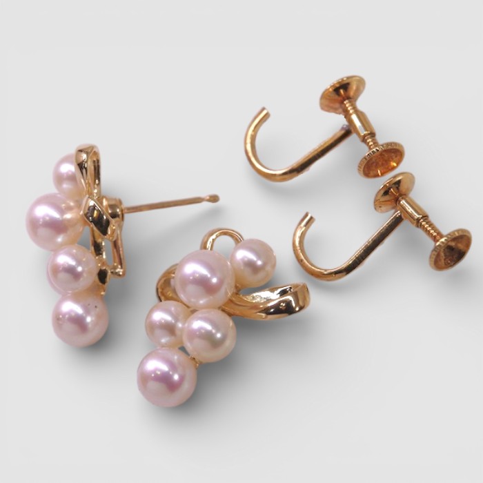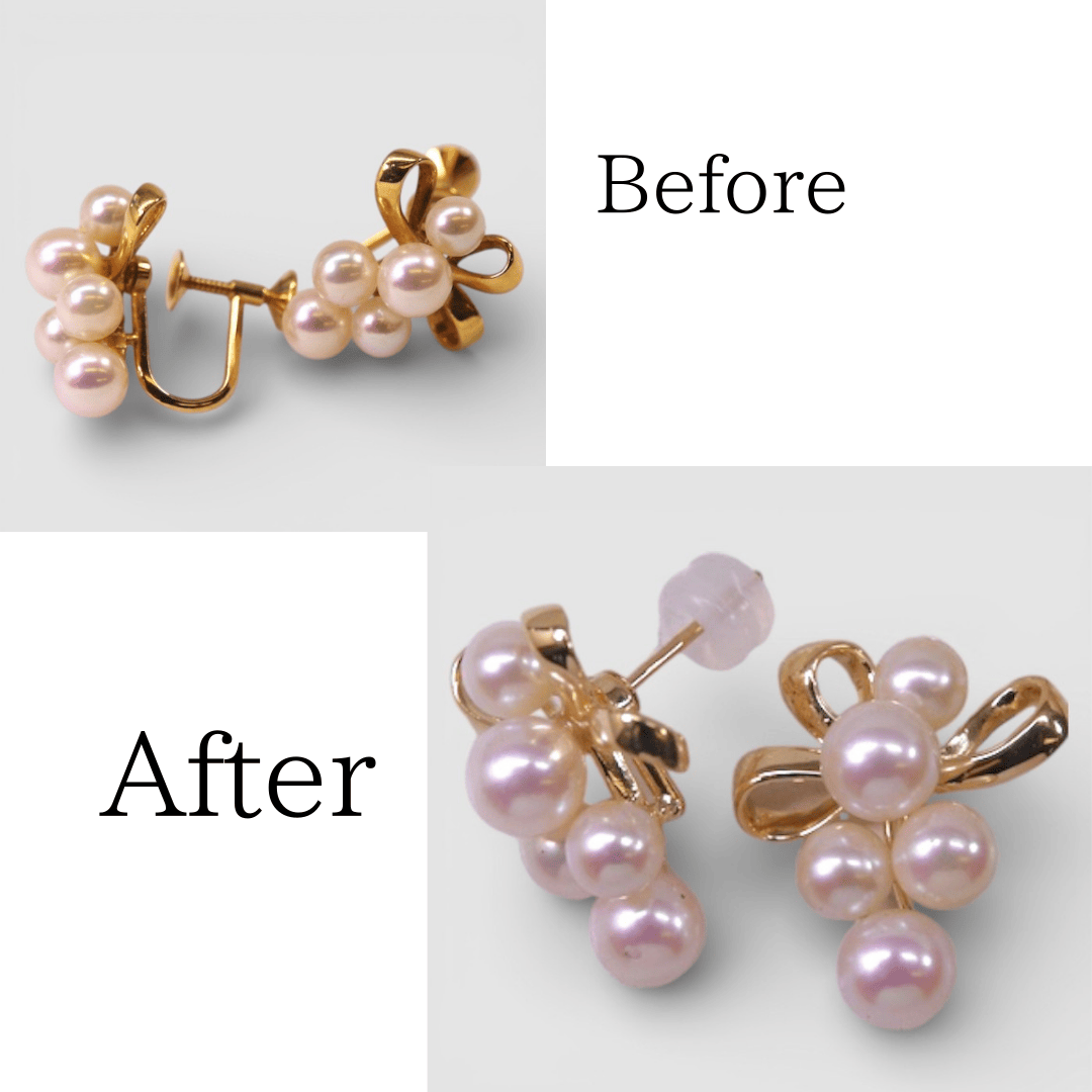 K18のベビーパールがたくさん付いたイヤリングを、ピアスへカスタマイズ(リフォーム)した事例です。