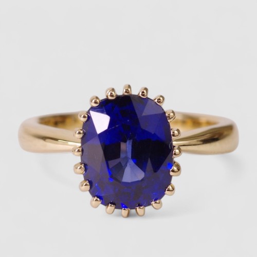 3.927ctという存在感のある再結晶サファイアを主役に据え、周囲の装飾を排したシンプル設計で色味と透明感を最大限に引き立てています。