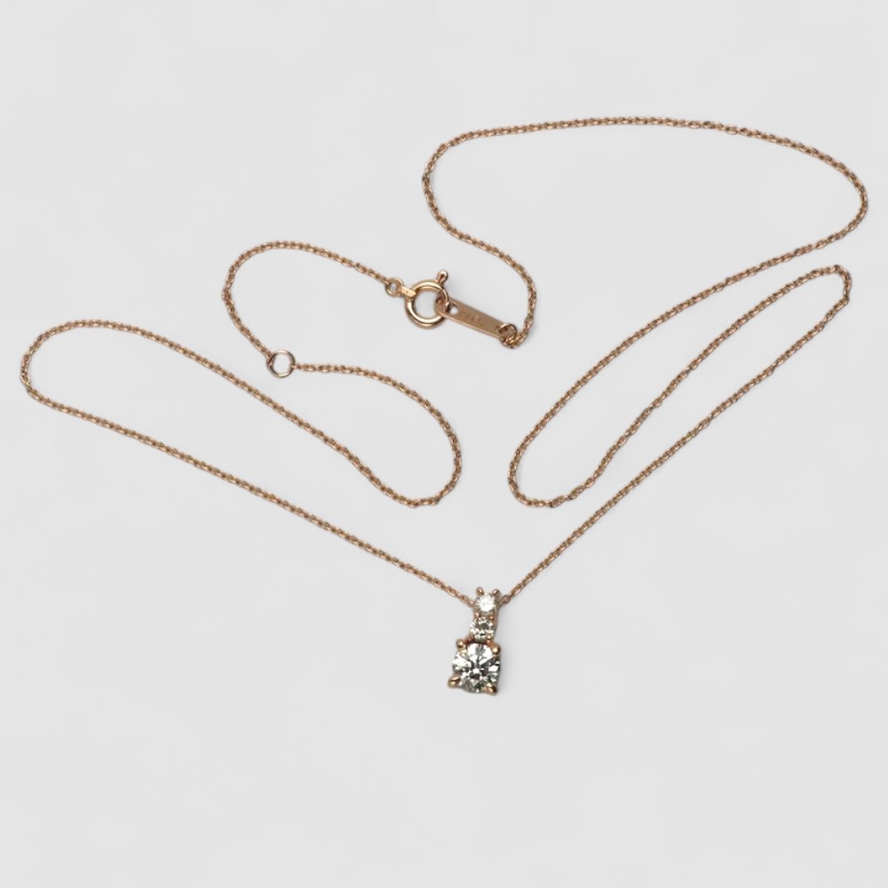 使用してK18ピンクゴールドの素材で縦に3個のダイアモンドペンダントを制作することになりました。エンゲージリングの土台のプラチナは下取りしました。ネックレスはご持参のメレダイアモンドお花モチーフペンダントを外して、そこにぶら下げるように制作しました。とても可愛く出来あがり、お客様は大喜びでした。