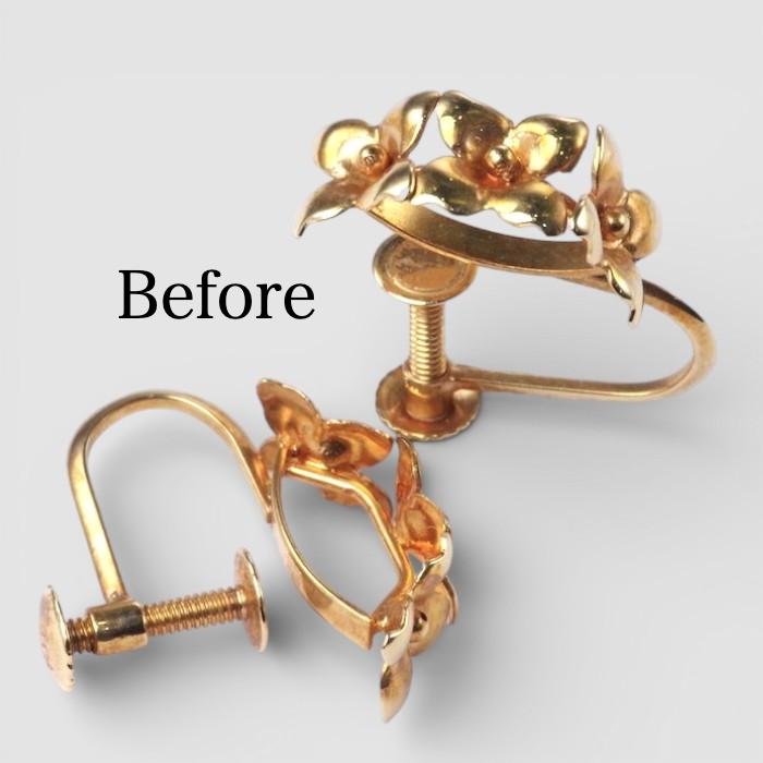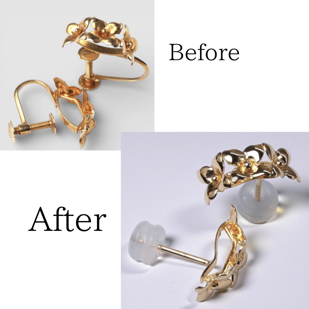 イヤリングのデザインを活かし、普段使いしやすいピアス仕様へリフォームした事例です。