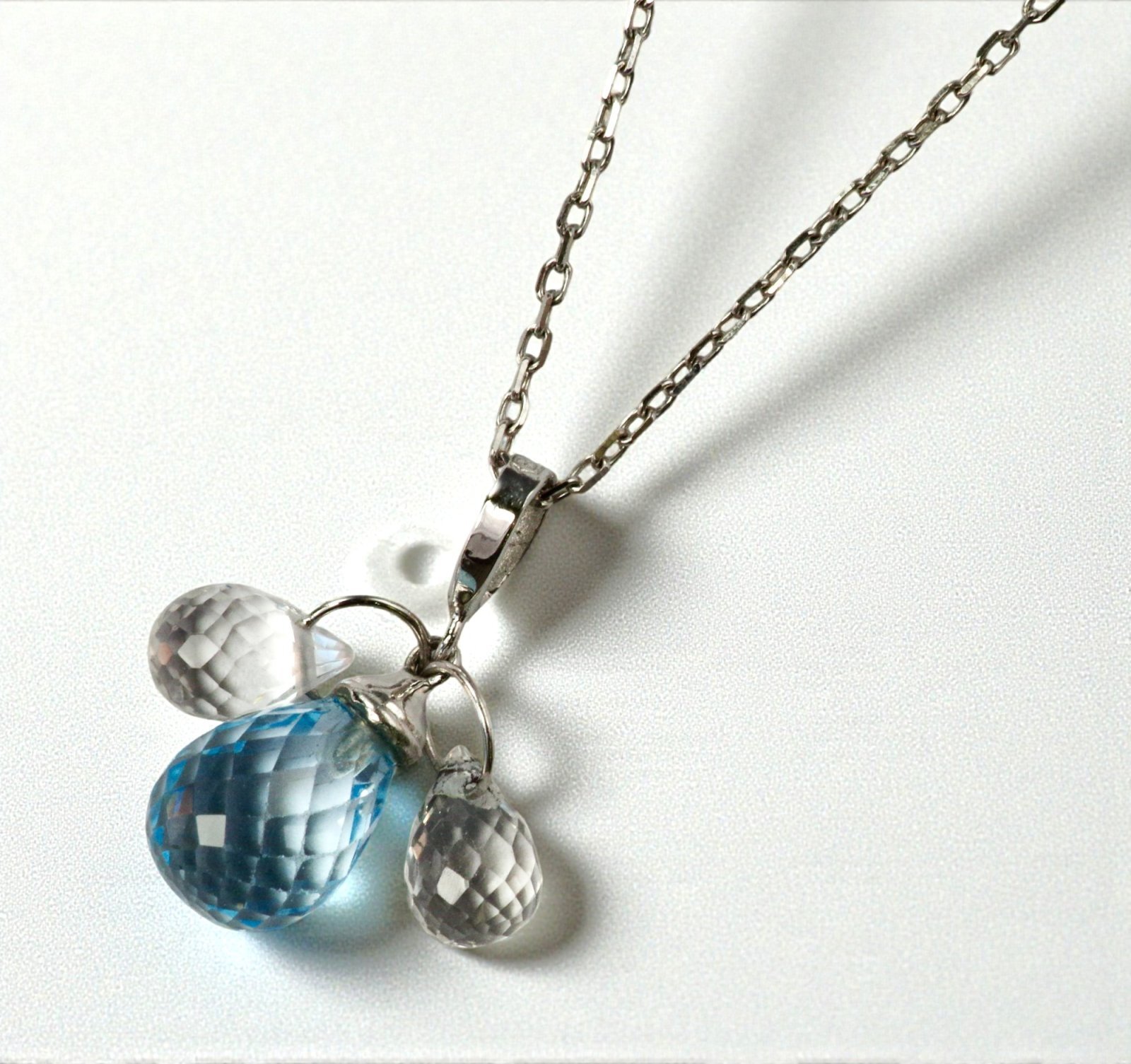 ブルートパーズと水晶の爽やかな輝きが胸元を彩る、ブリオレットカットネックレス。
