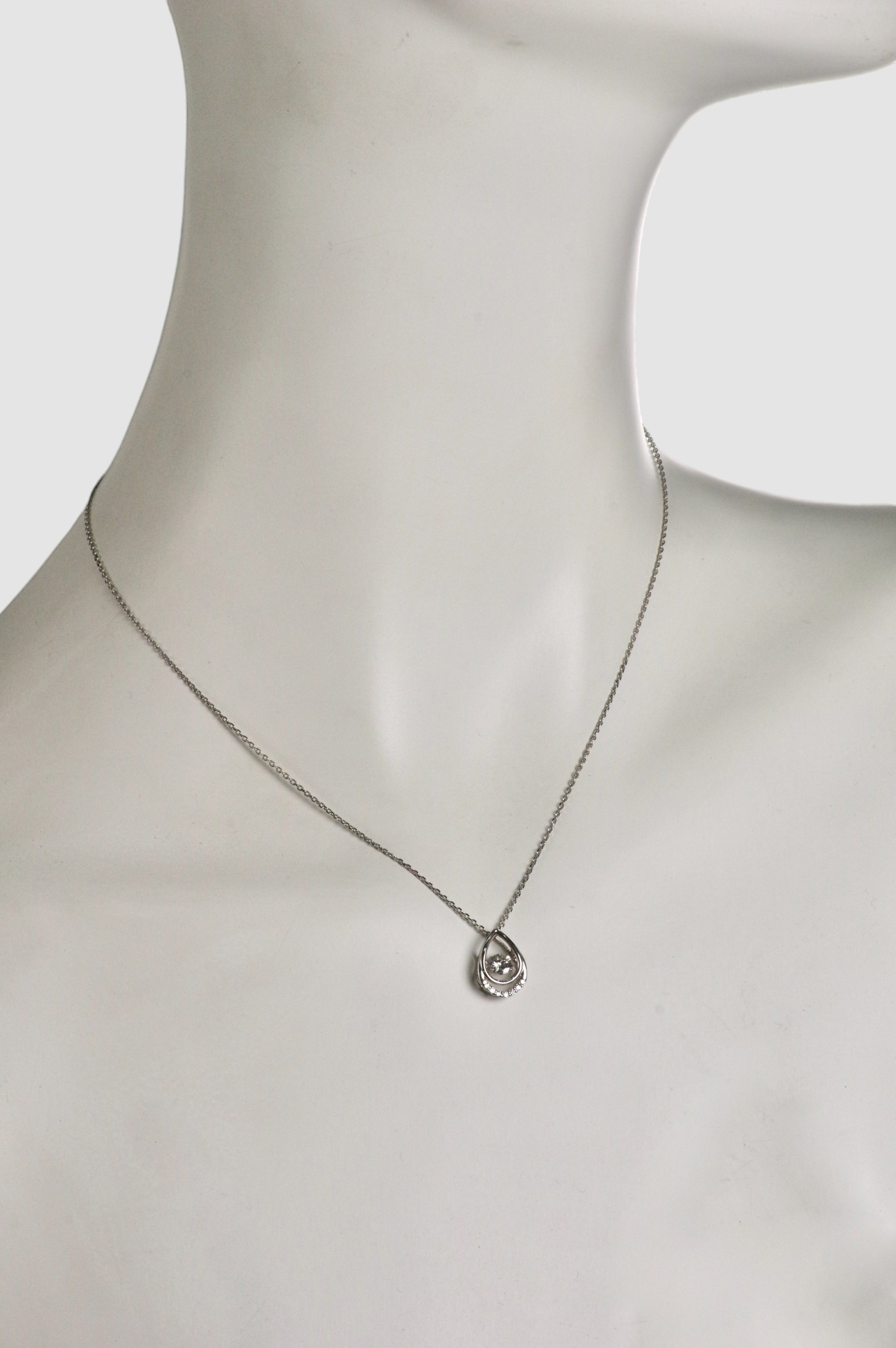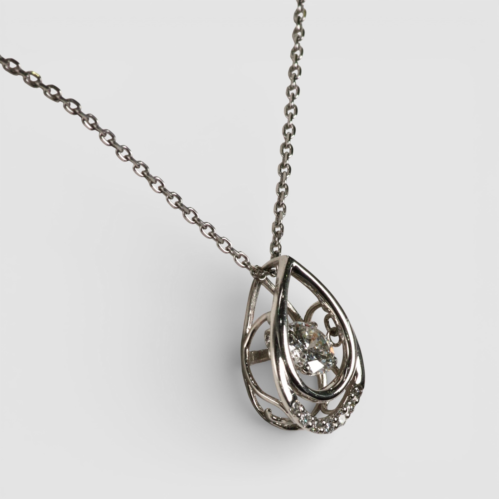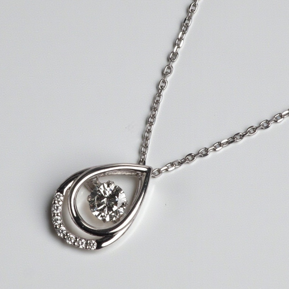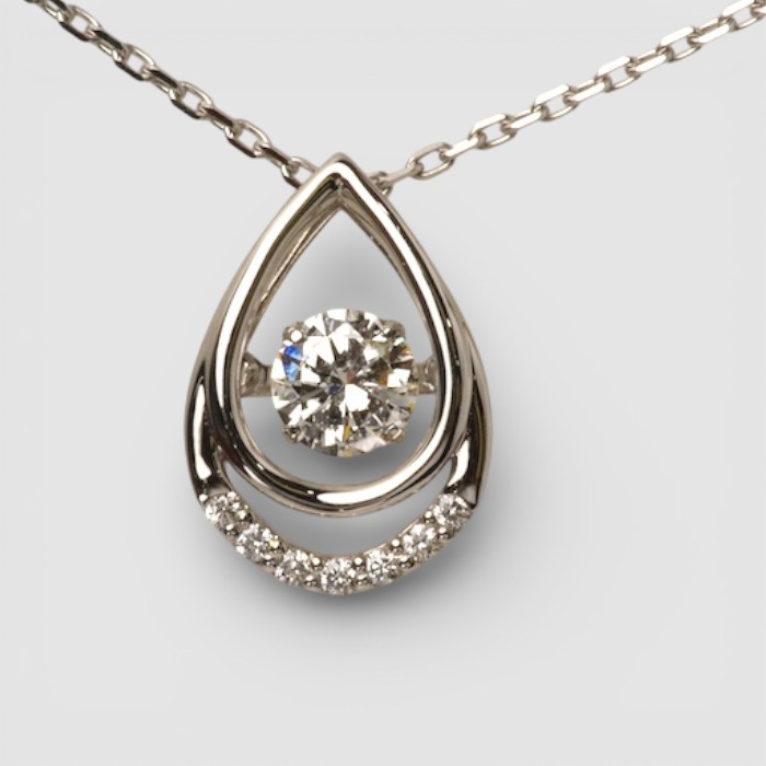 わずかな振動でダイヤが揺れ、輝き続ける「ダンシングストーン」が主役のペンダントネックレスです。
