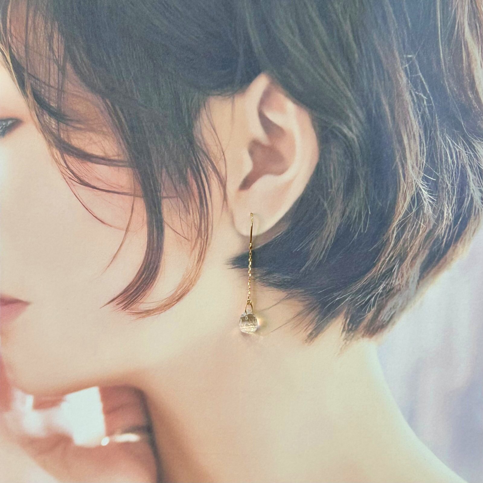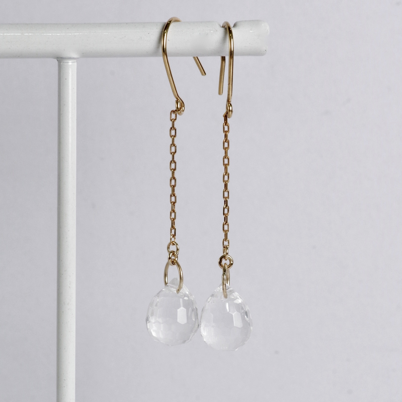 K18 ブリオレットカット水晶ピアスは、K18イエローゴールドのチェーンに、透明感あふれるブリオレットカットの水晶をあしらったロングピアスです。