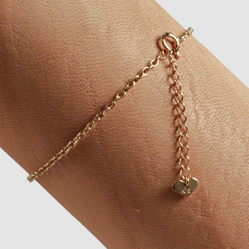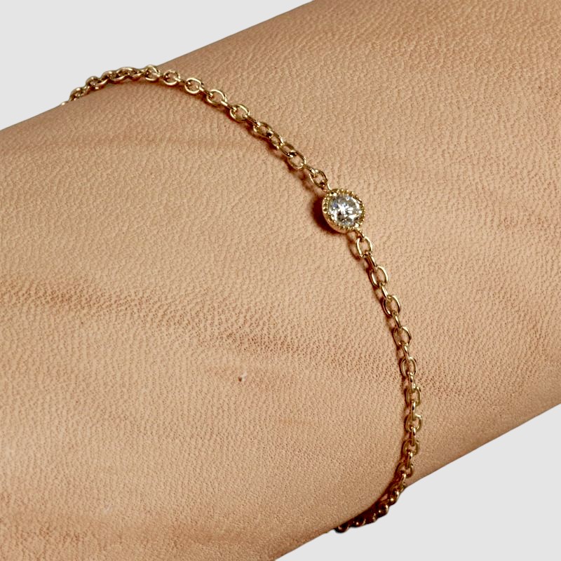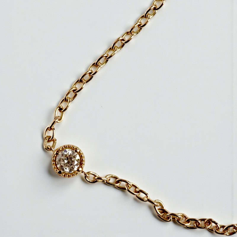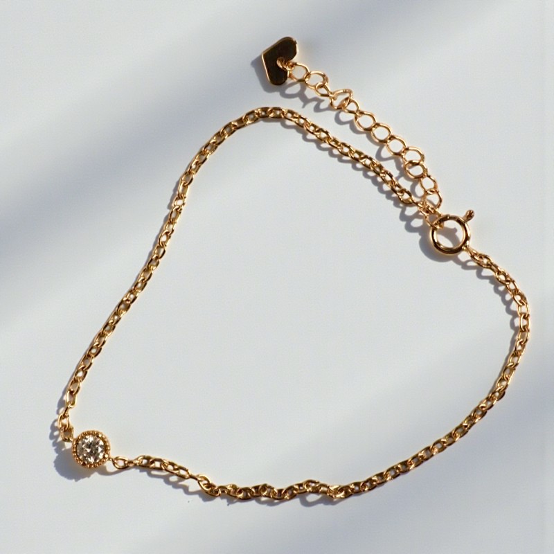 K18チェーンにダイヤモンドを一粒だけ。さりげない輝きが手元を上品に見せてくれる、 毎日使いにちょうどいいブレスレットです。エンドパーツの小さなハートも、可愛いポイント。