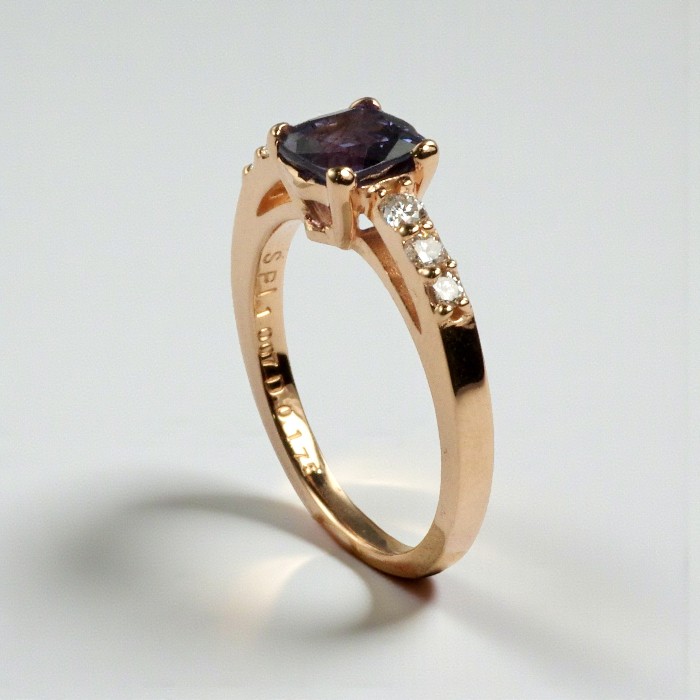 約1ctの美しいバイオレットスピネルを主役に、サイドにメレダイヤをあしらった ピンクゴールドリングを制作いたしました。