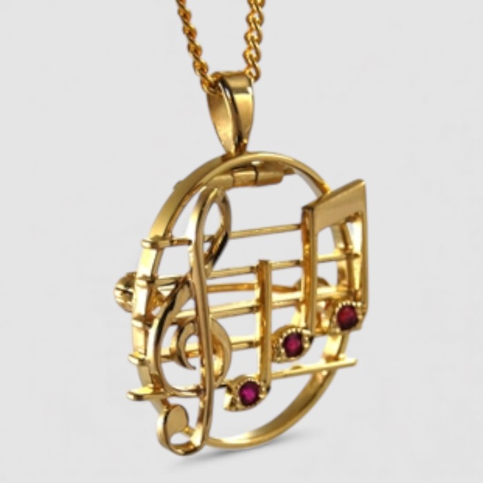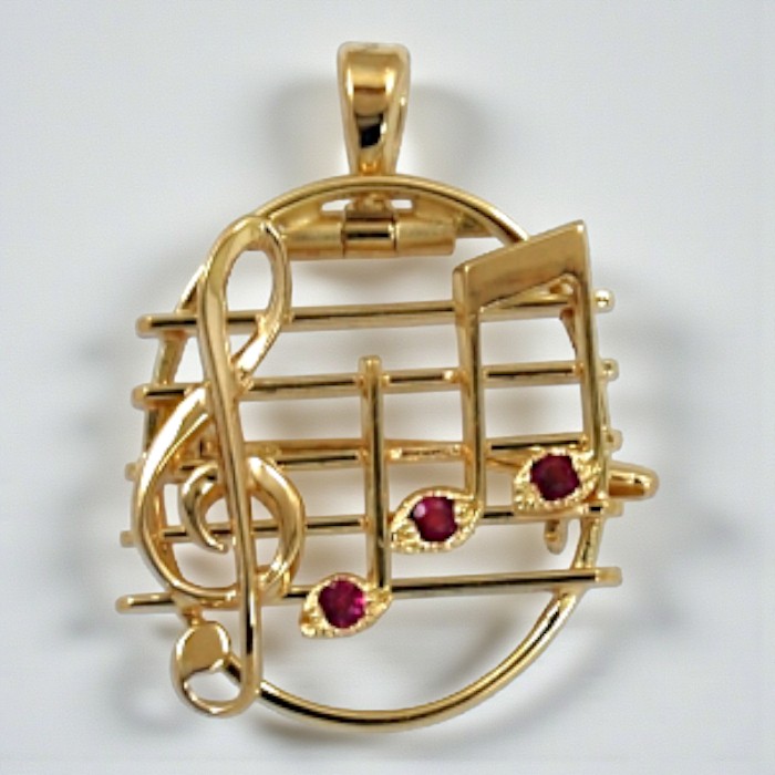 M様より「音符モチーフのペンダント兼ブローチ」をオーダーいただきました。K18の温かみとルビーの彩りが調和した、愛らしいジュエリーです。