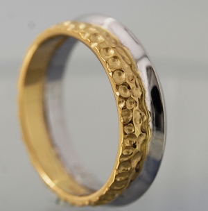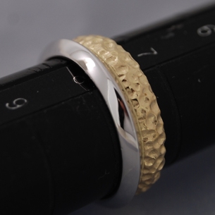 H様からのご依頼。使わなくなったプラチナリング枠を利用して、ピンキーリングを制作して欲しいという内容でした。デザインを色々考え、当店オリジナルリングを参考にK18と、Pt900のコンビで制作することになりました。金のリングはハンマー打ちの用な模様を付け、プラチナリングはシンプルに鏡面加工にしました。何処にもないようなデザインにH様は大満足でした。K18は当店から、プラチナはお客様ご持参のものを使用し、余ったプラチナは当店で買い取りました。