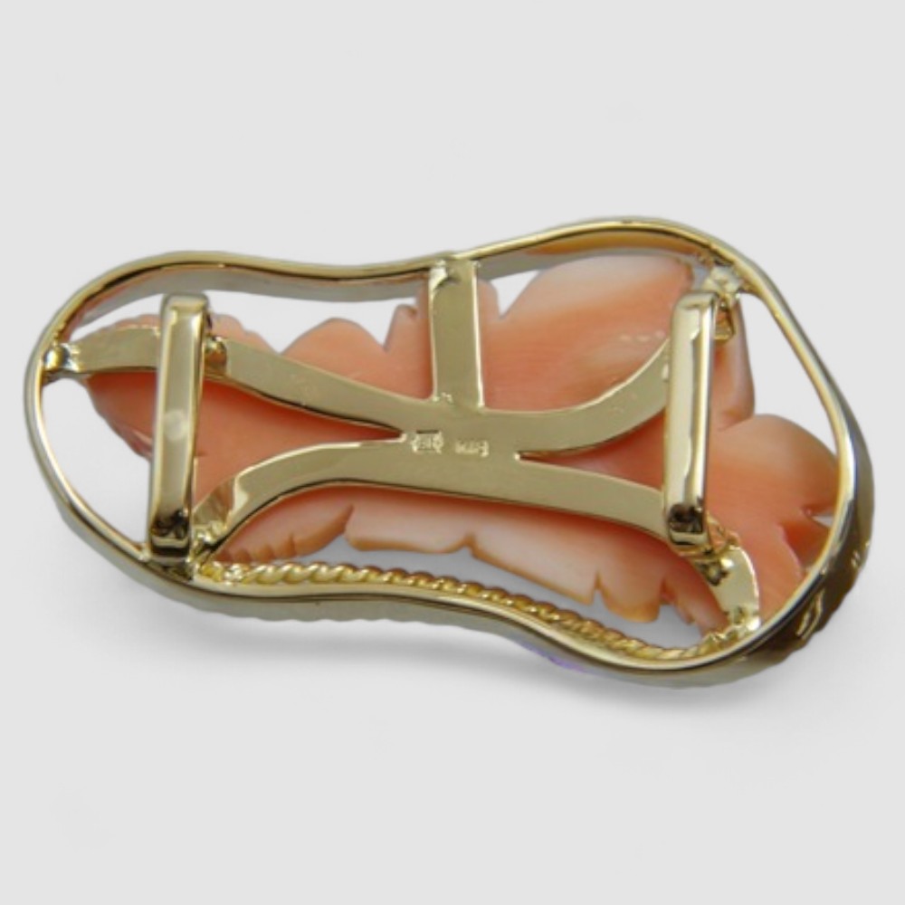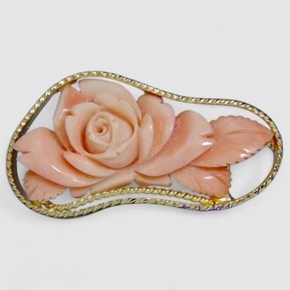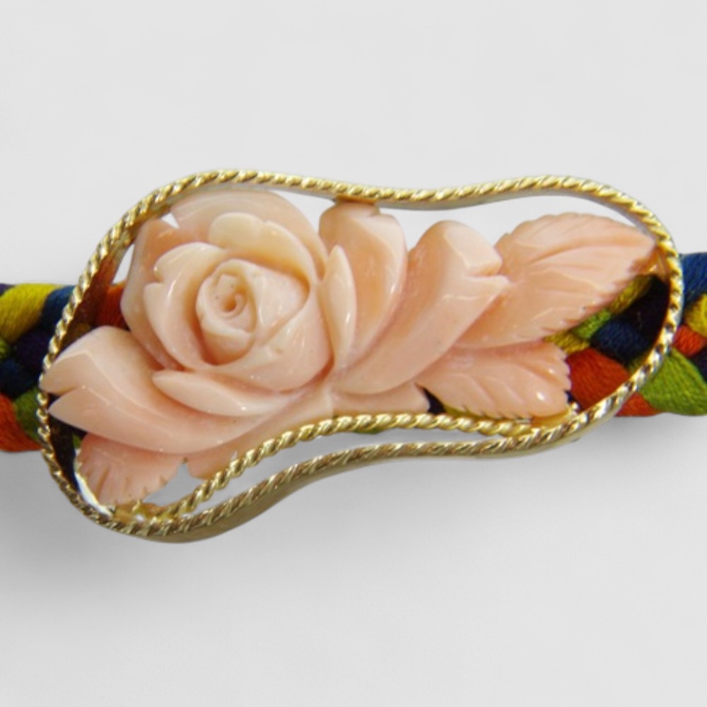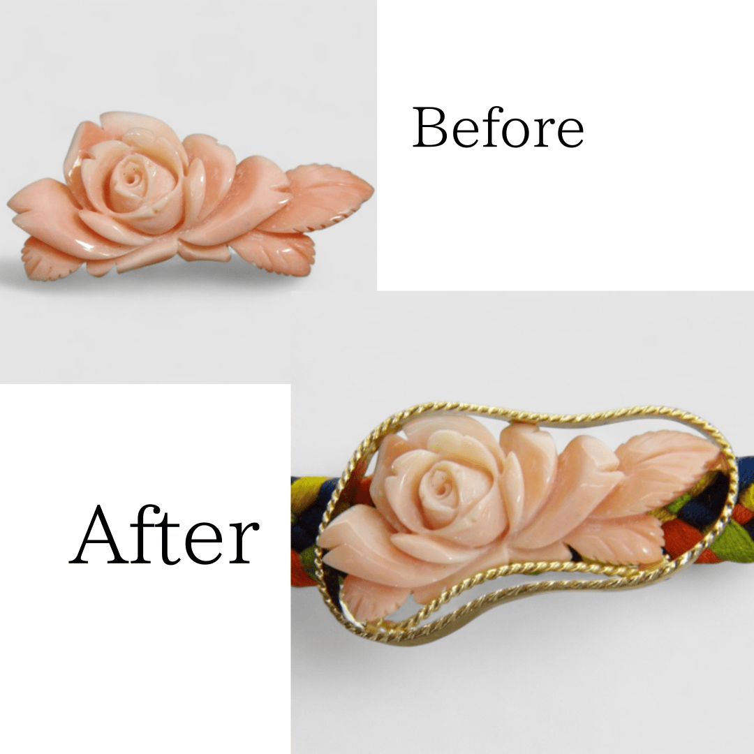 お持ち込みのK18地金を溶かして再利用し、珊瑚を縁取る装飾はロープ状に加工。シンプルながらも上品で高級感のあるデザインに仕上げました。彫りの美しい珊瑚が主役となり、和装に華を添える一点物の帯留めが完成しました。