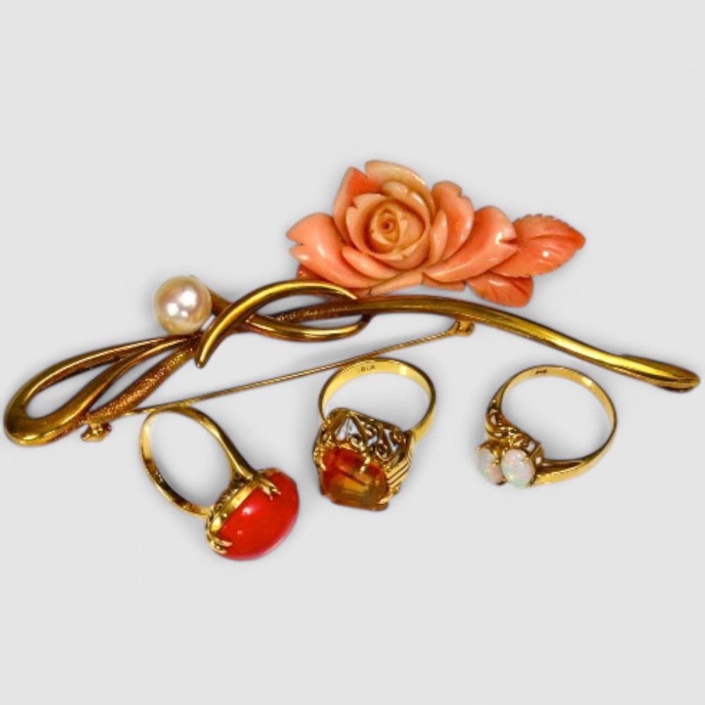 お母様への心のこもったプレゼントとして、帯留めの制作をご依頼いただきました。素材として、使わなくなったK18パールブローチ、珊瑚の指輪、シトリンの指輪、そしてバラの彫りが入った珊瑚のブローチなど、たくさんのジュエリーをお持ち込みになられました。