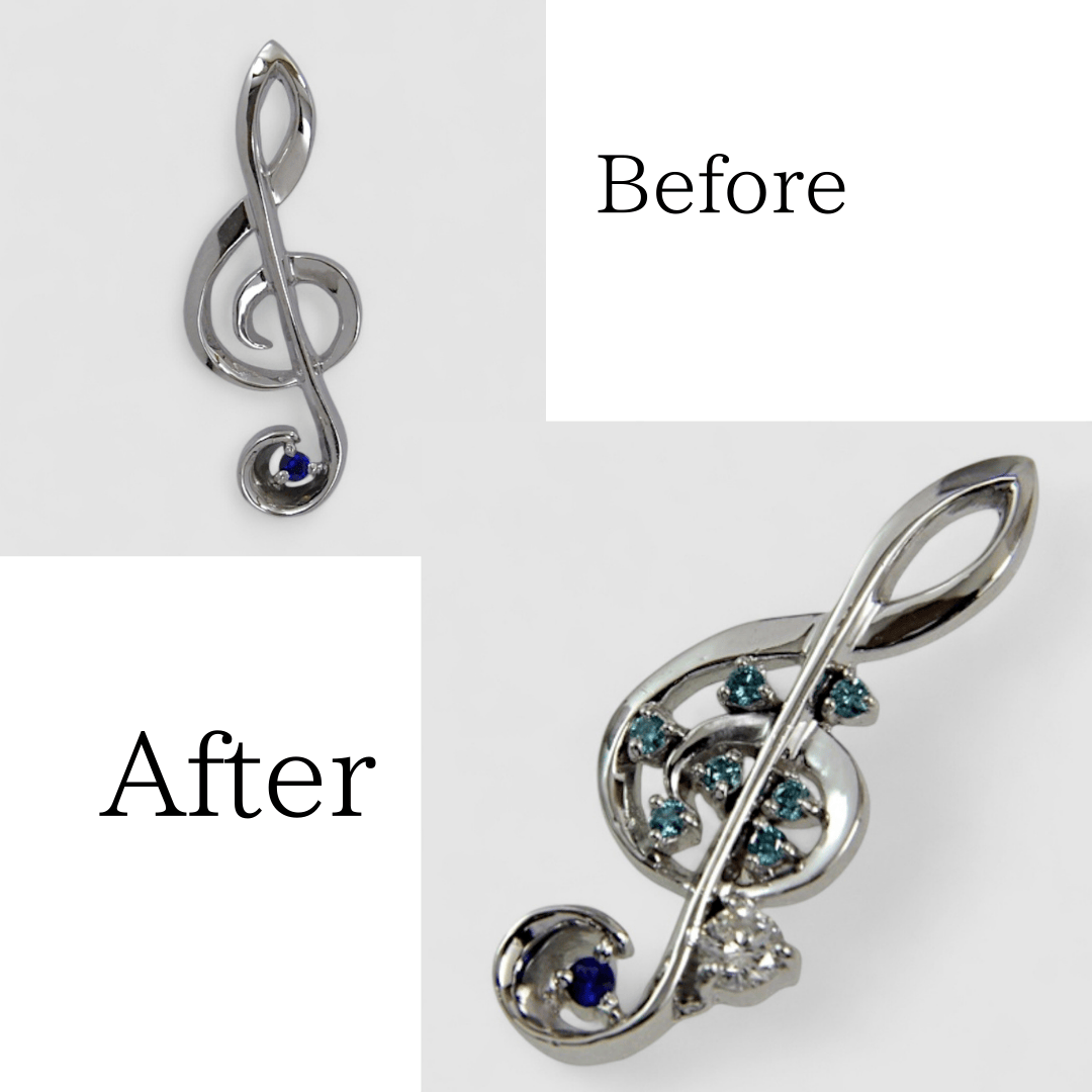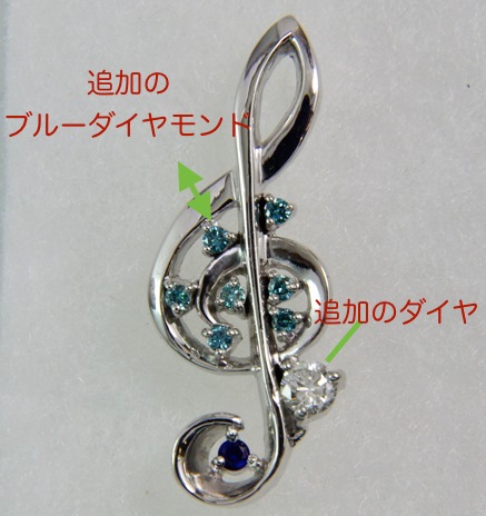 以前当店でPt900ト音記号タイニーピンを制作されたA様より、「サファイヤだけでは少し淋しいので、ダイヤモンドを追加して華やかにしたい」と、リフォームのご相談をいただきました。